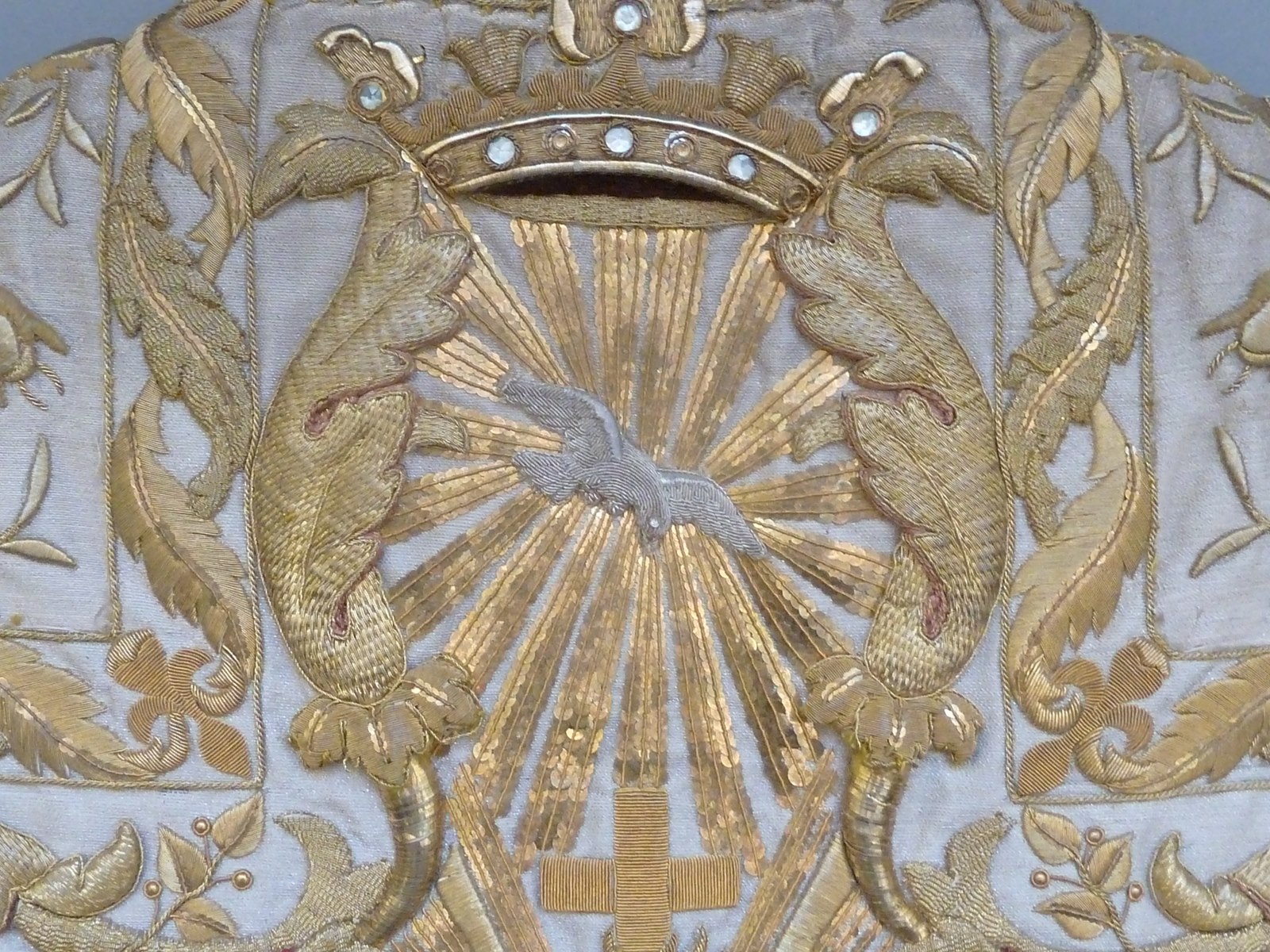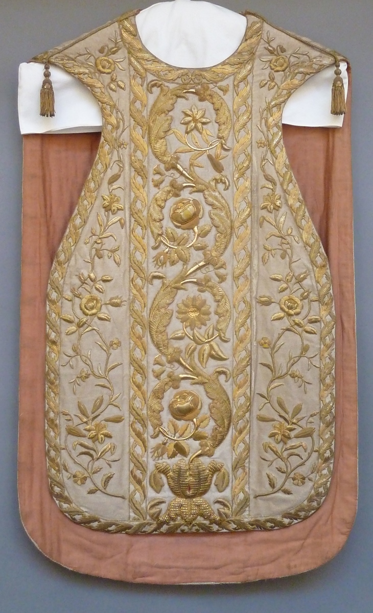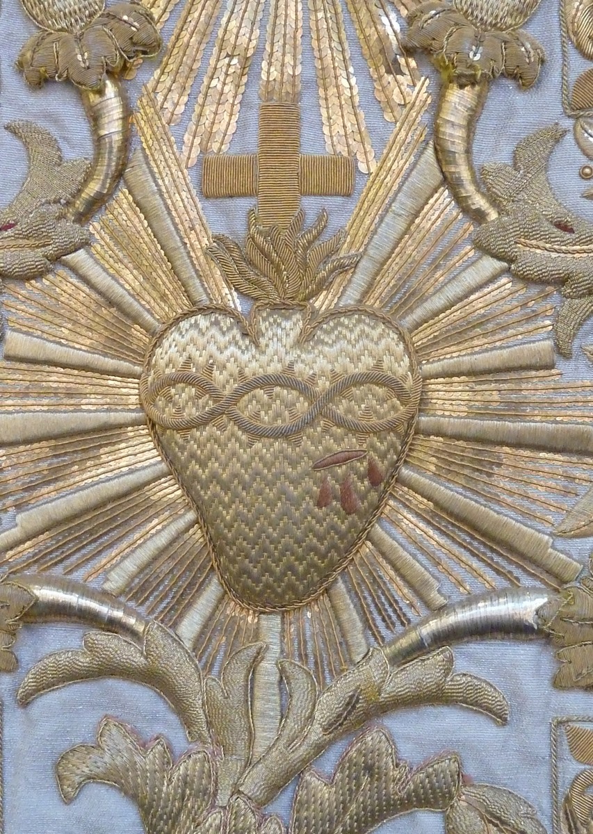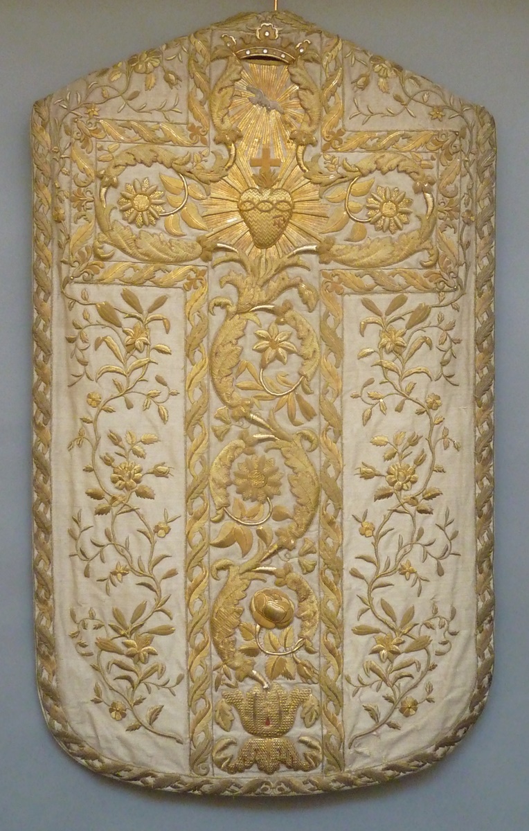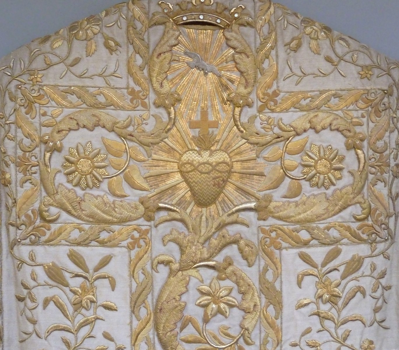 Wit kazuifel met bloem- en bladslingers van gouddraad, op kruis vlammend hart in stralenkrans