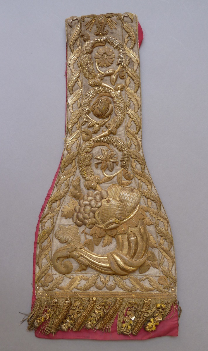 Witte manipel met bloem- en bladslingers van gouddraad, met goudfranje