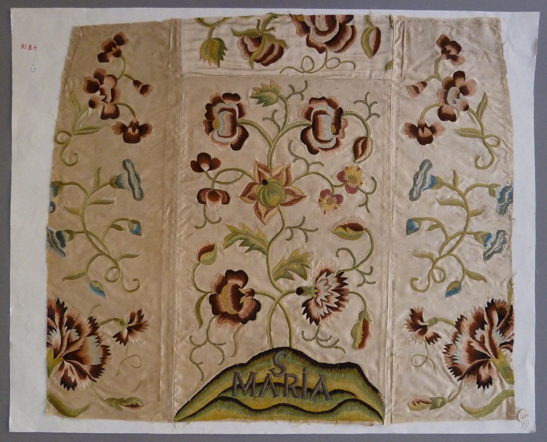Fragment Mariakleding: voorschootje geborduurd met bloemen en grasveld