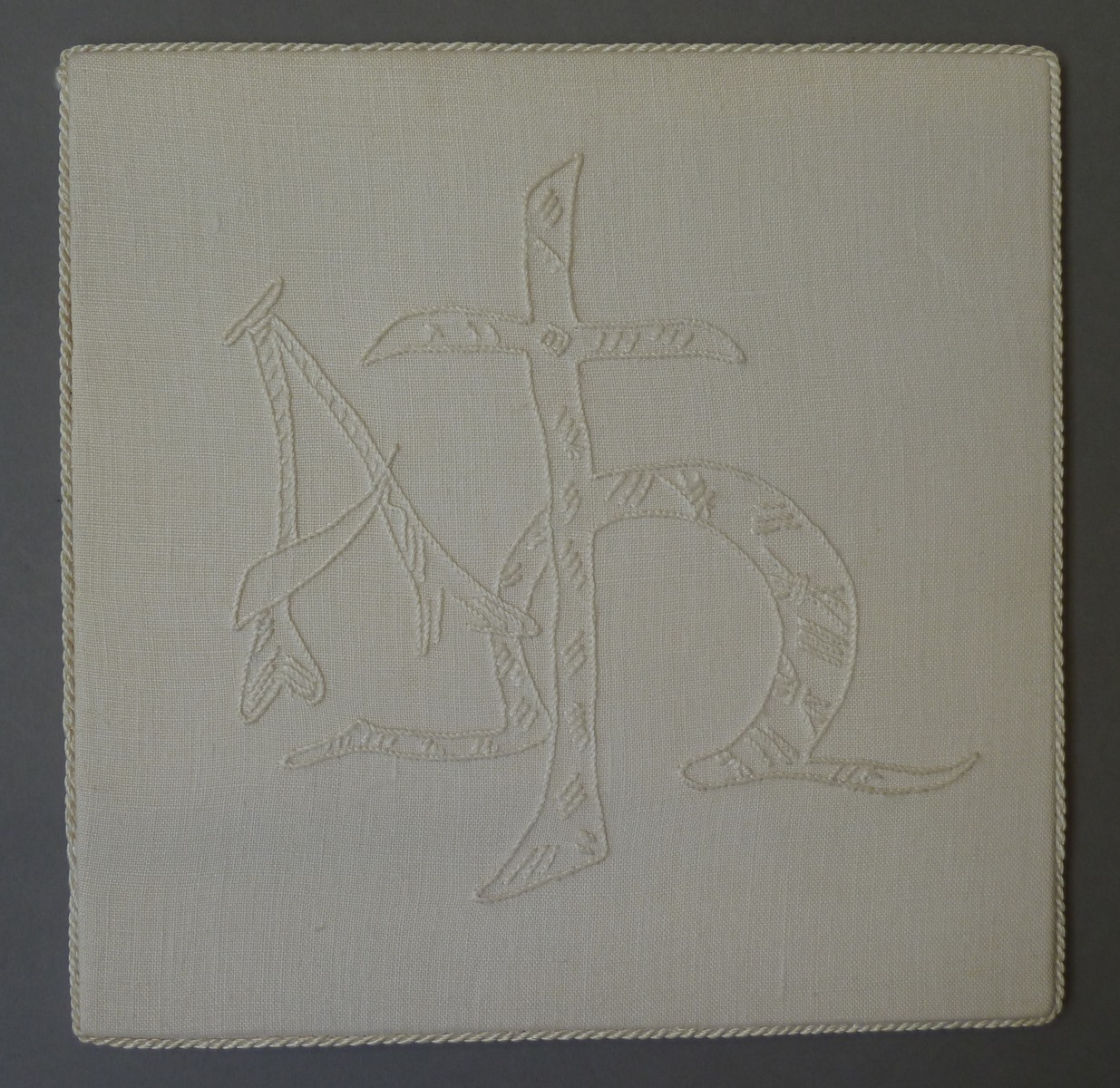 Witte palla met voorstelling van Alfa en Omega en kruis