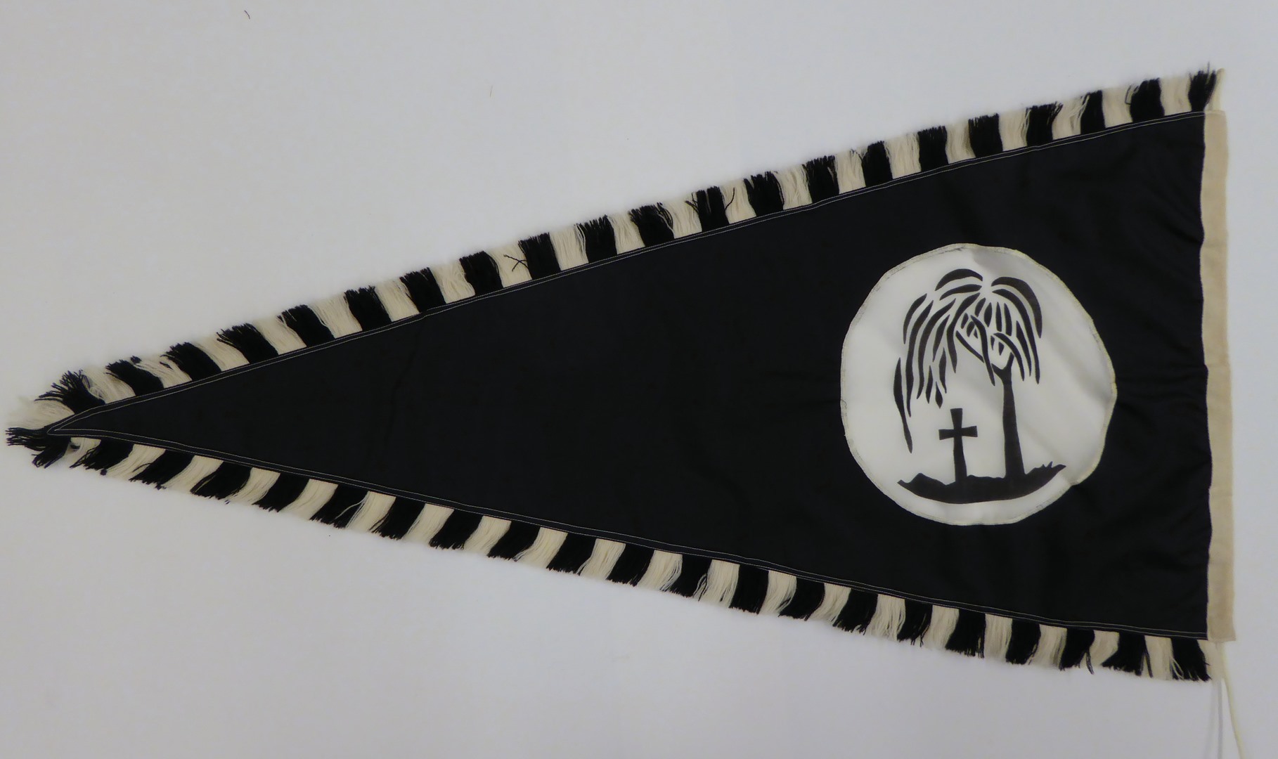 Zwart rouwvaan met geverfde voorstelling van treurwilg waaronder grafkruis