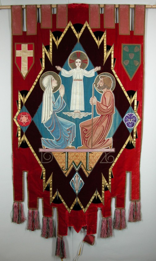 Rood processievaandel met H. Familie: staand Christuskind, geknielde Maria en Jozef, wapens van Utrecht en Bussum