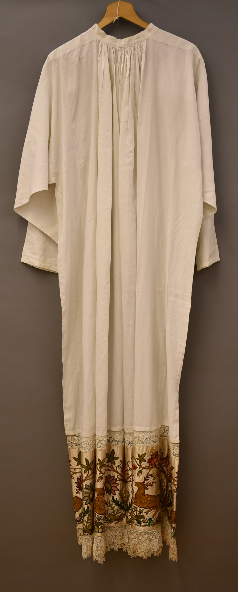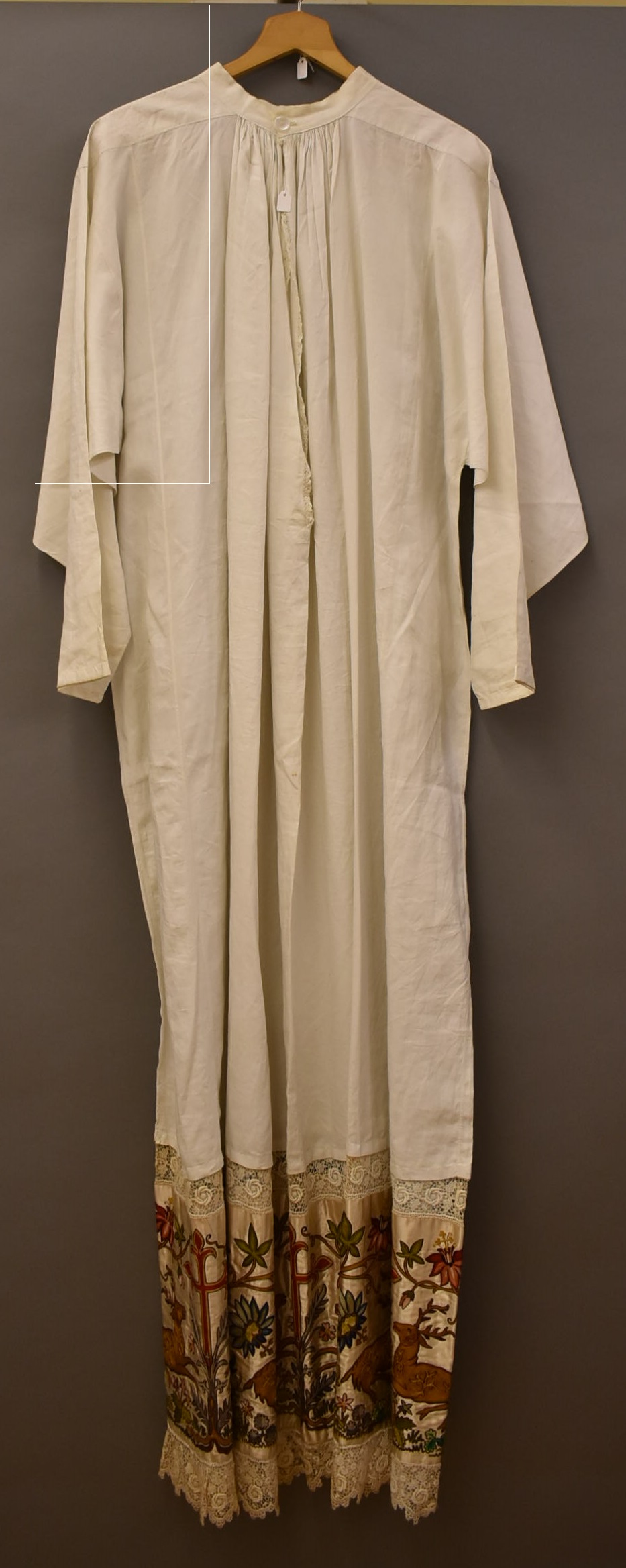 Albe met rand geborduurd met geaffronteerde herten en kruis, afgezet met machinale naaldkant