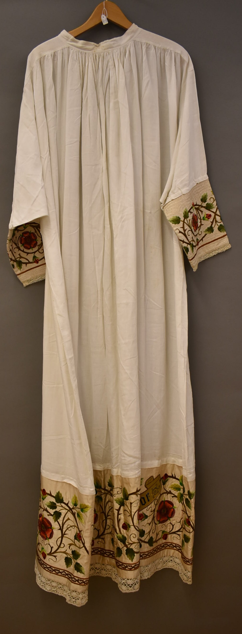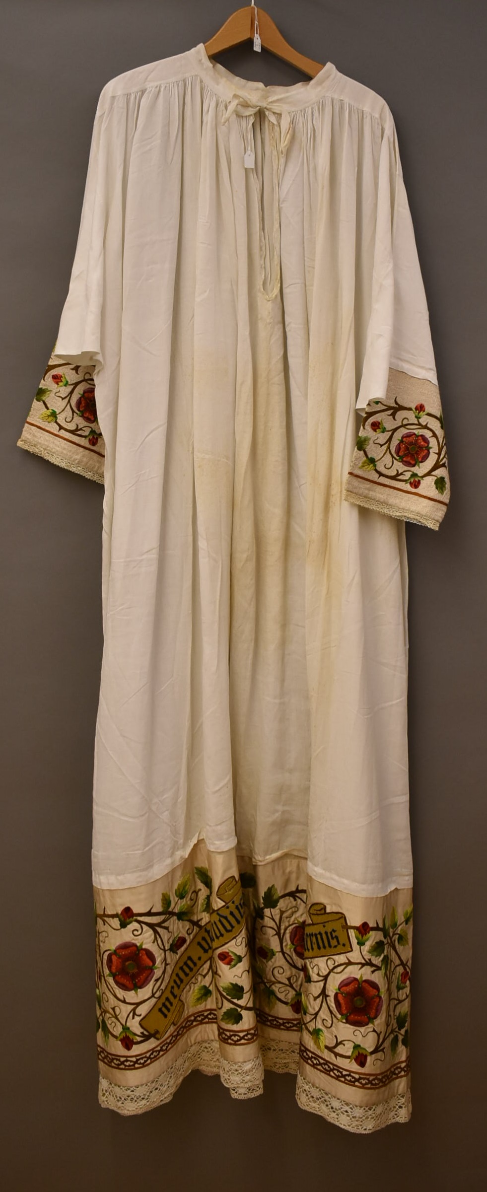 Albe met geborduurde rand met passiebloemen en banderollen met tekst