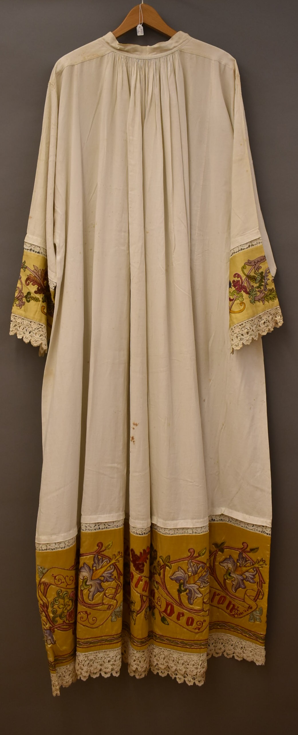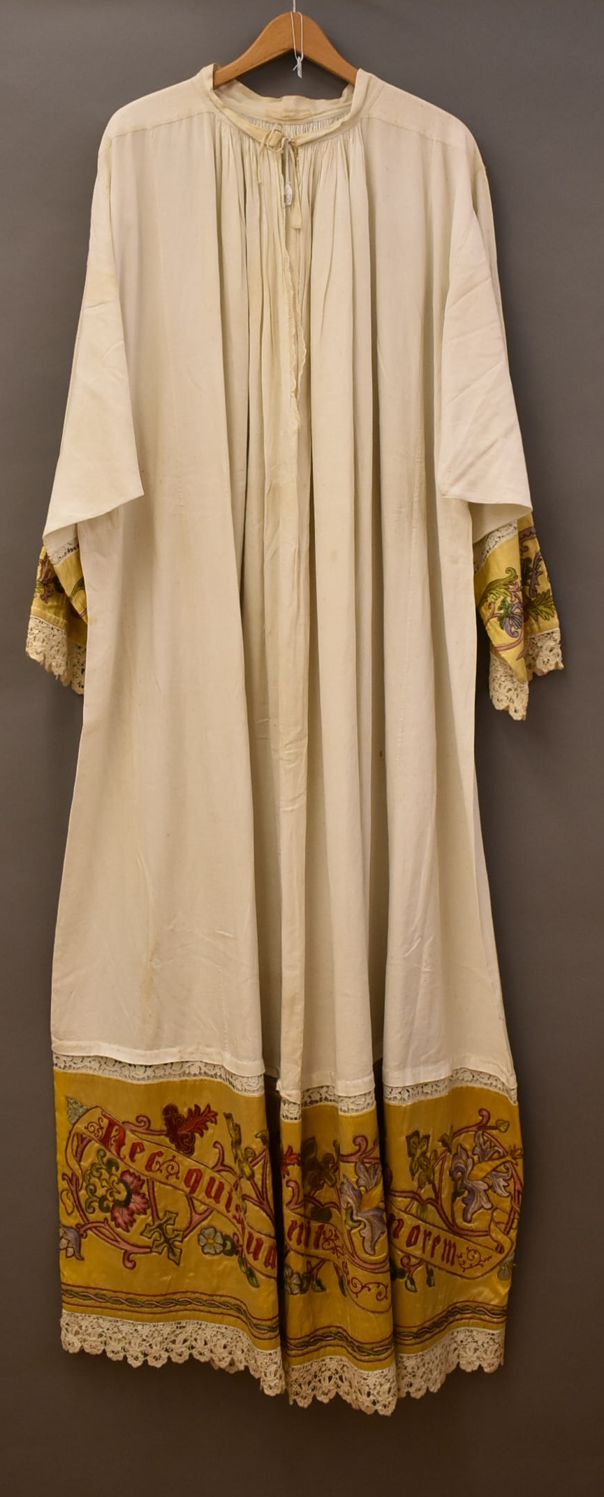 Albe met goudgele banden met geborduurde bloemranken en banderollen met tekst