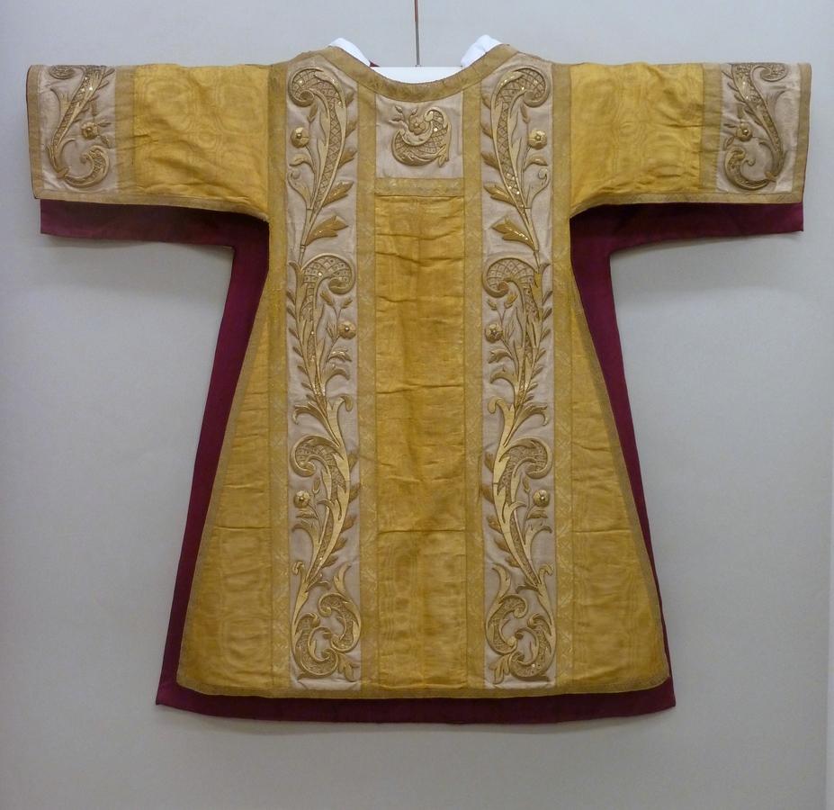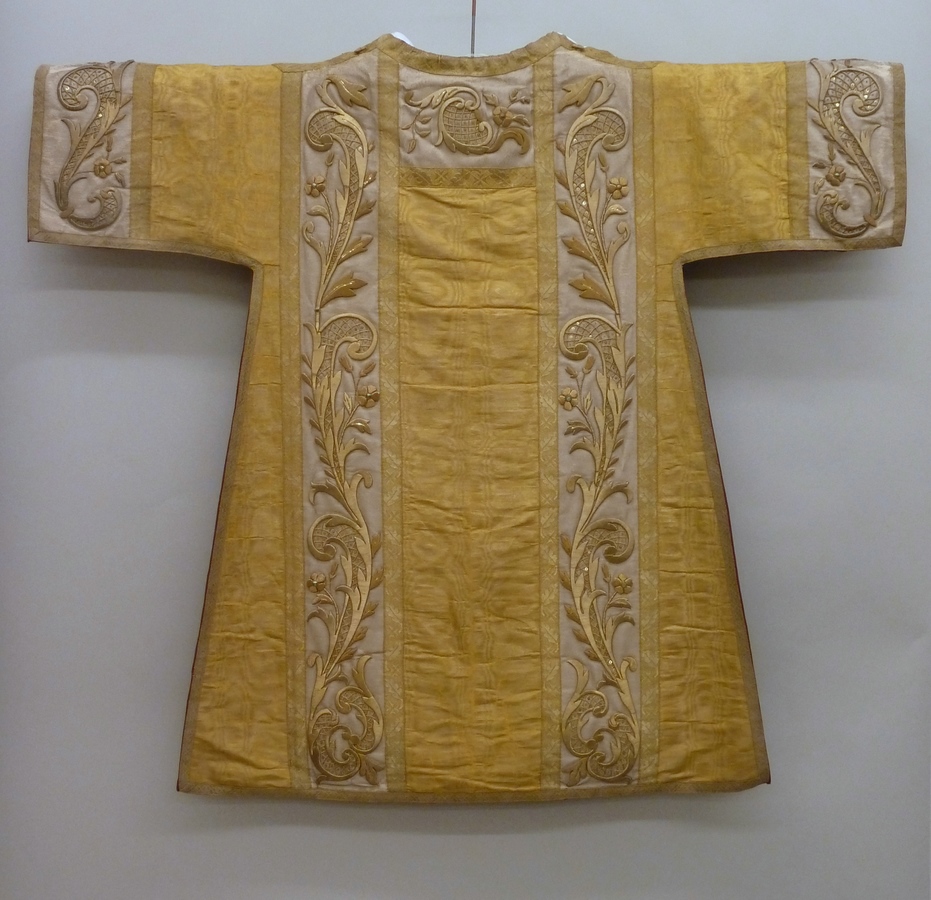 Goudkleurige dalmatiek met versiering in goud hoogrelief op witte ondergrond