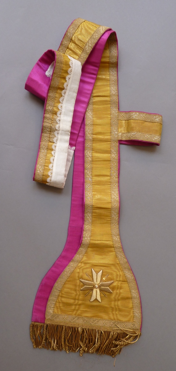 Goudkleurige lofstola met versiering in goud hoogreliëf op witte achtergrond