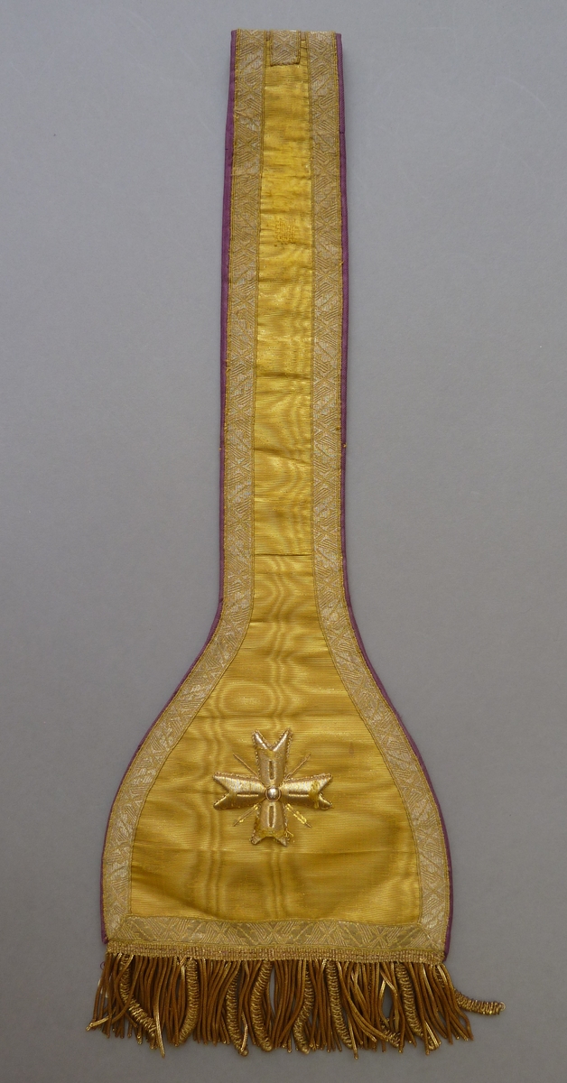 Goudkleurige manipel met versiering in goud hoogreliëf, met goudfranje