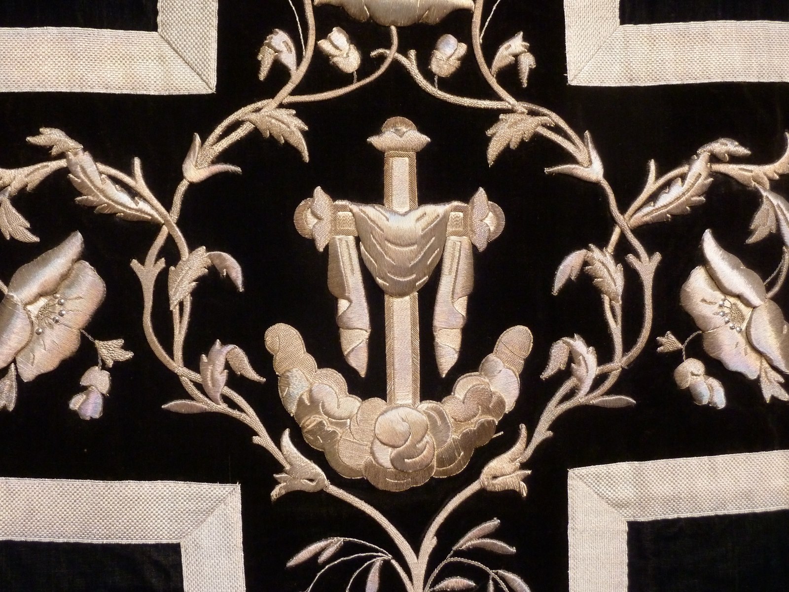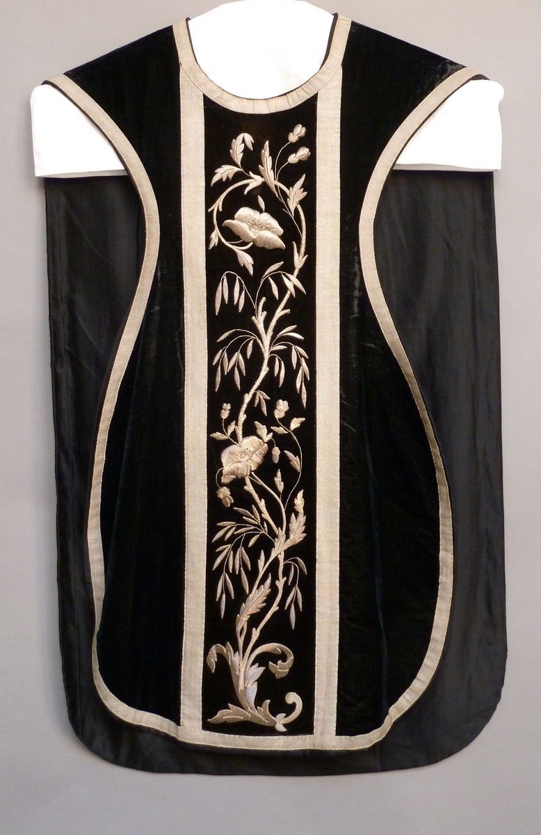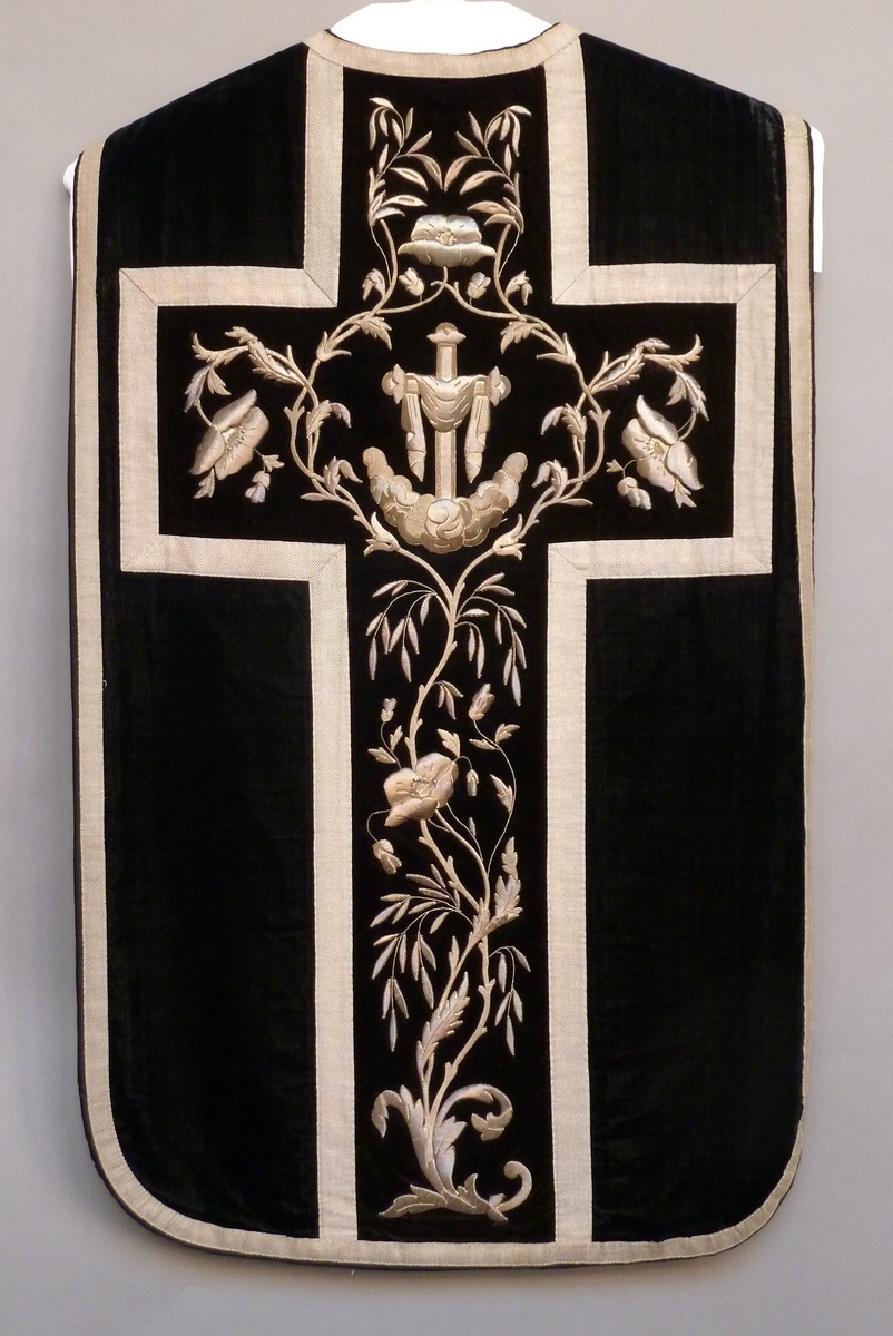 Zwart kazuifel met borduursel van zilverdraad en kruis op wolk
