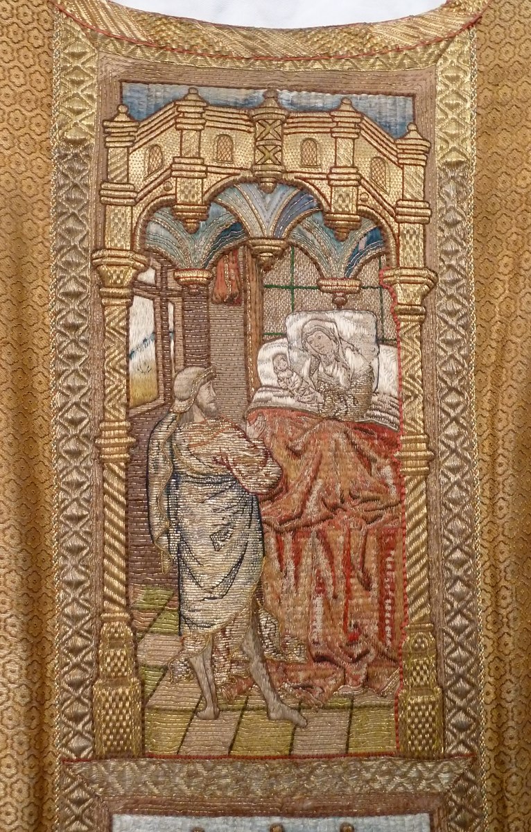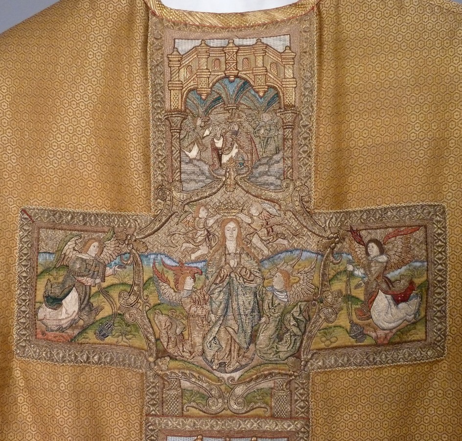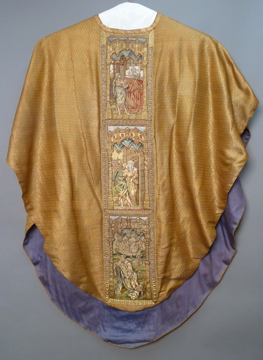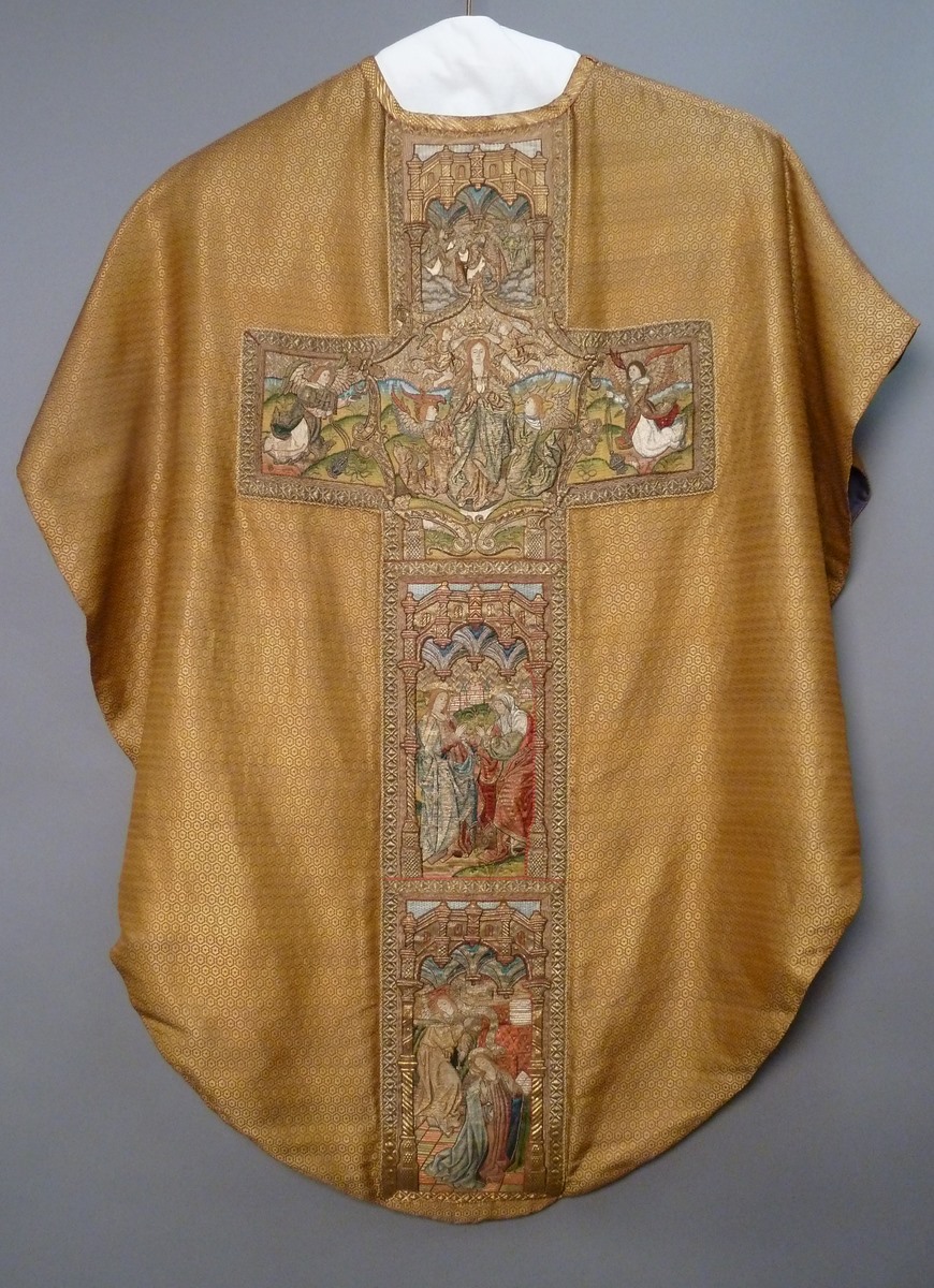 Goudkleurig kazuifel met ingeweven rozetjes, borduurwerk met scènes uit het leven van Maria