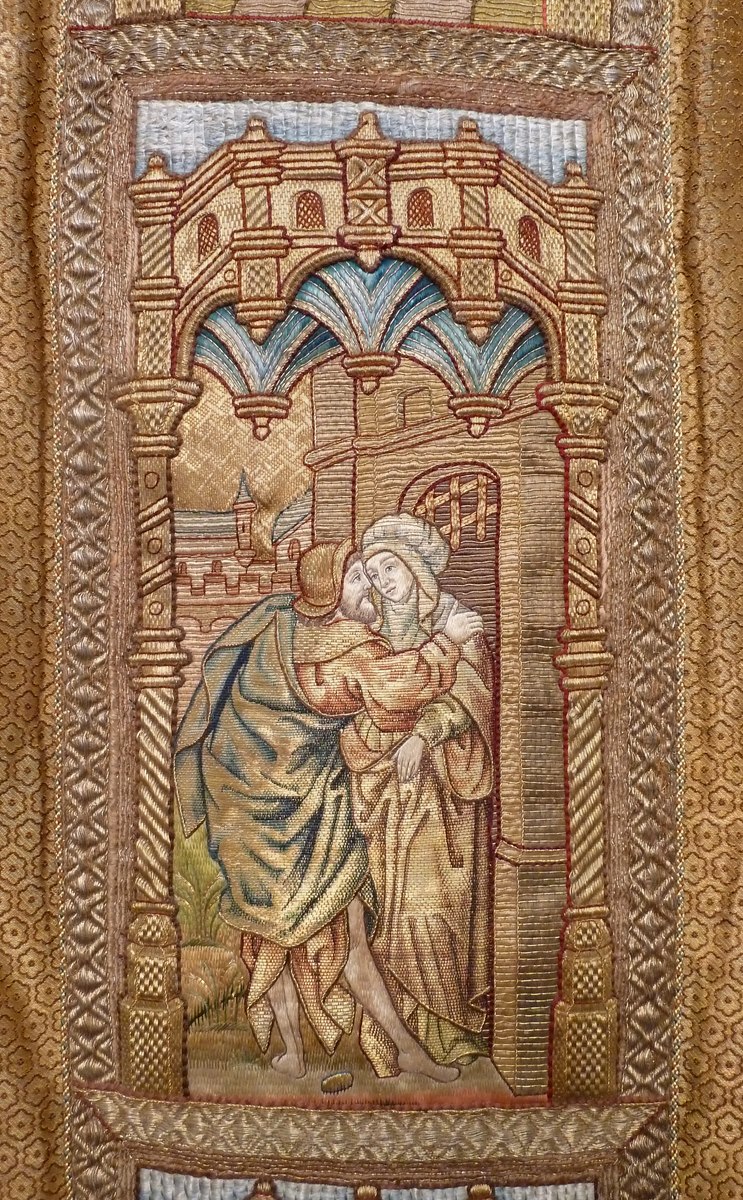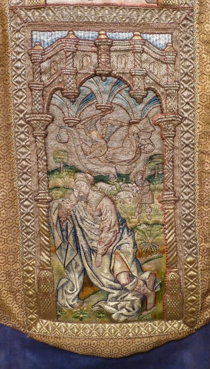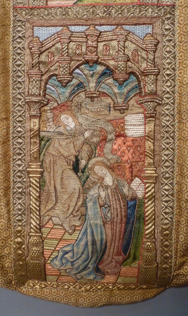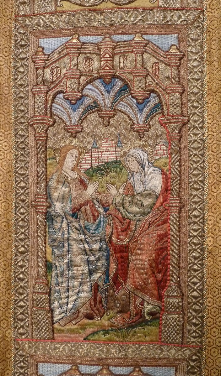 Goudkleurig kazuifel met ingeweven rozetjes, borduurwerk met scènes uit het leven van Maria