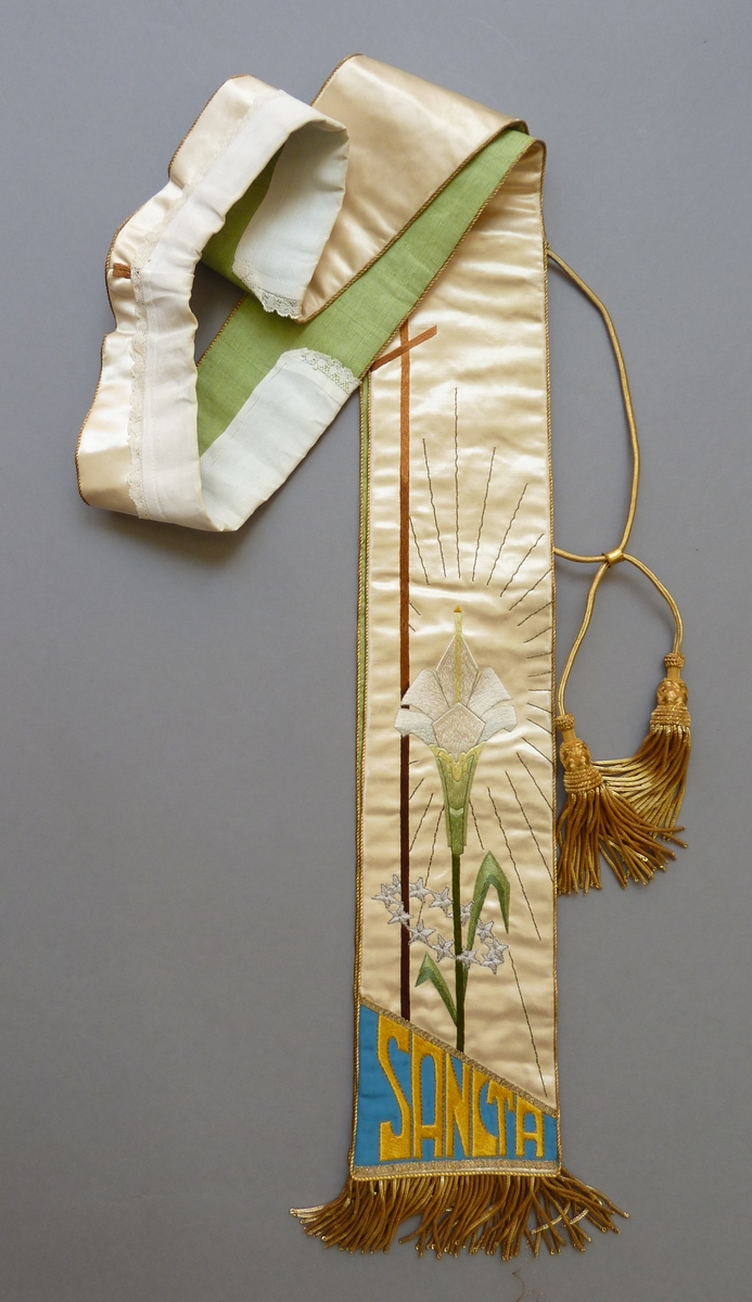 Witte stola geborduurd met kruis, lelie, sterren en SANCTA andere zijde idem met MARIA