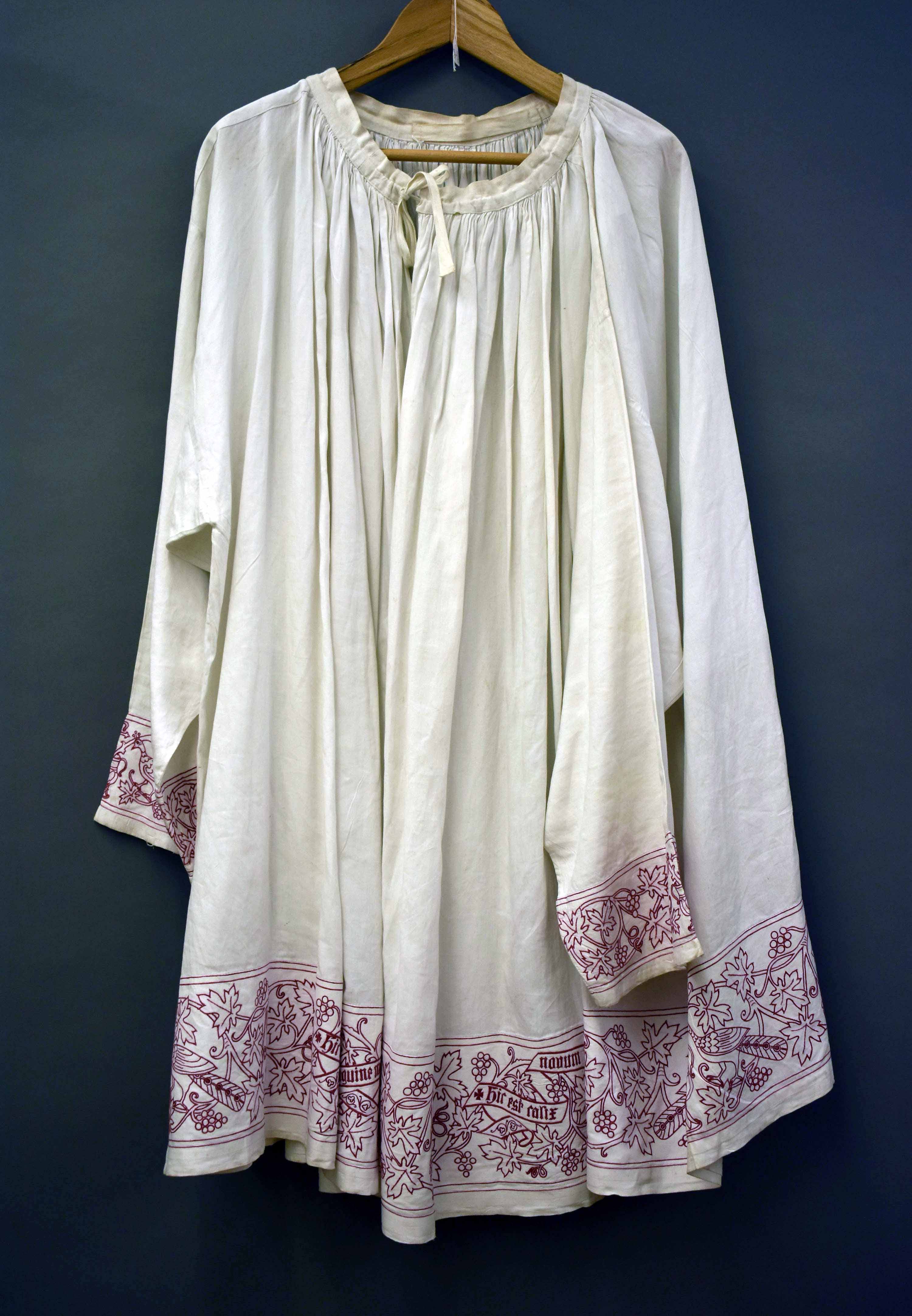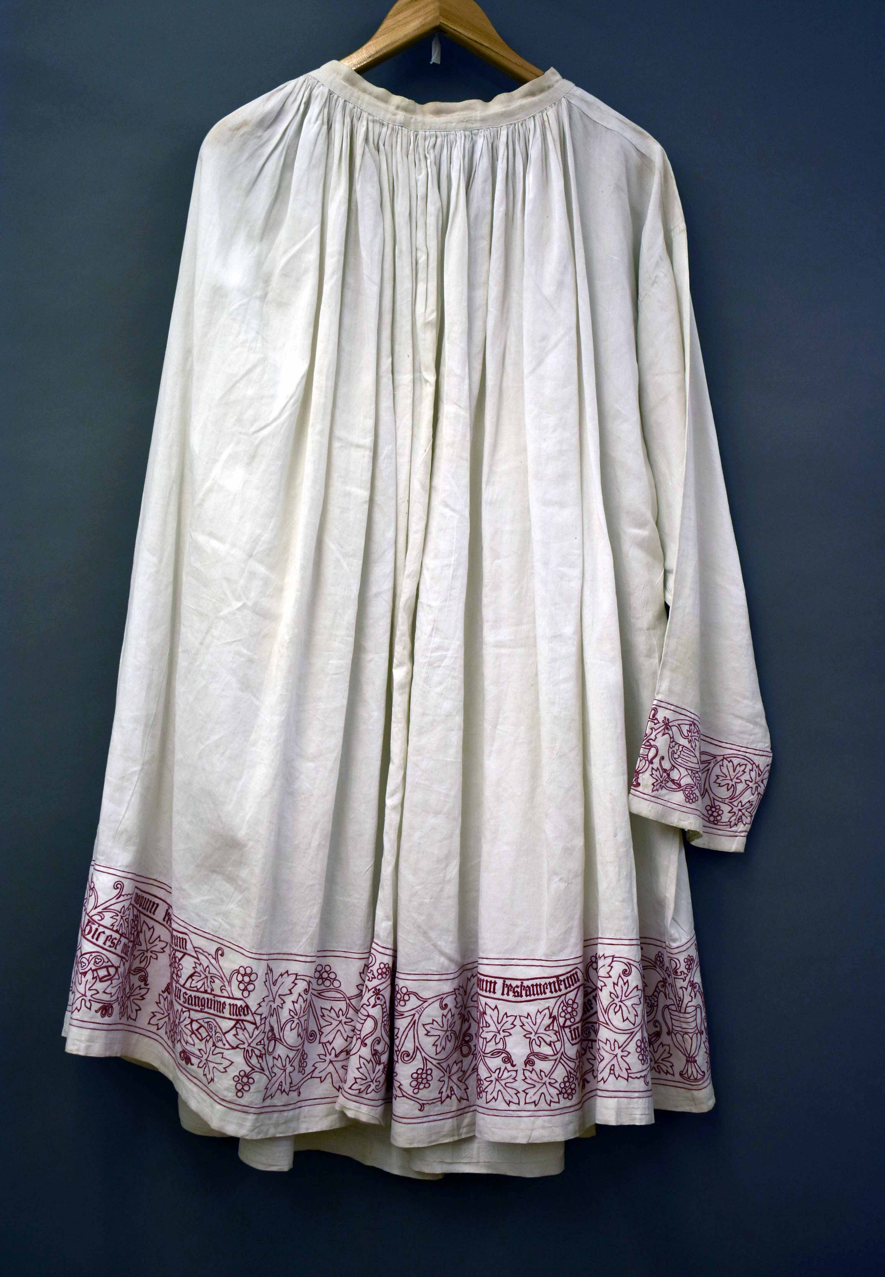 Rochet met rood borduursel van druivenranken, pauwen en tekstbanden