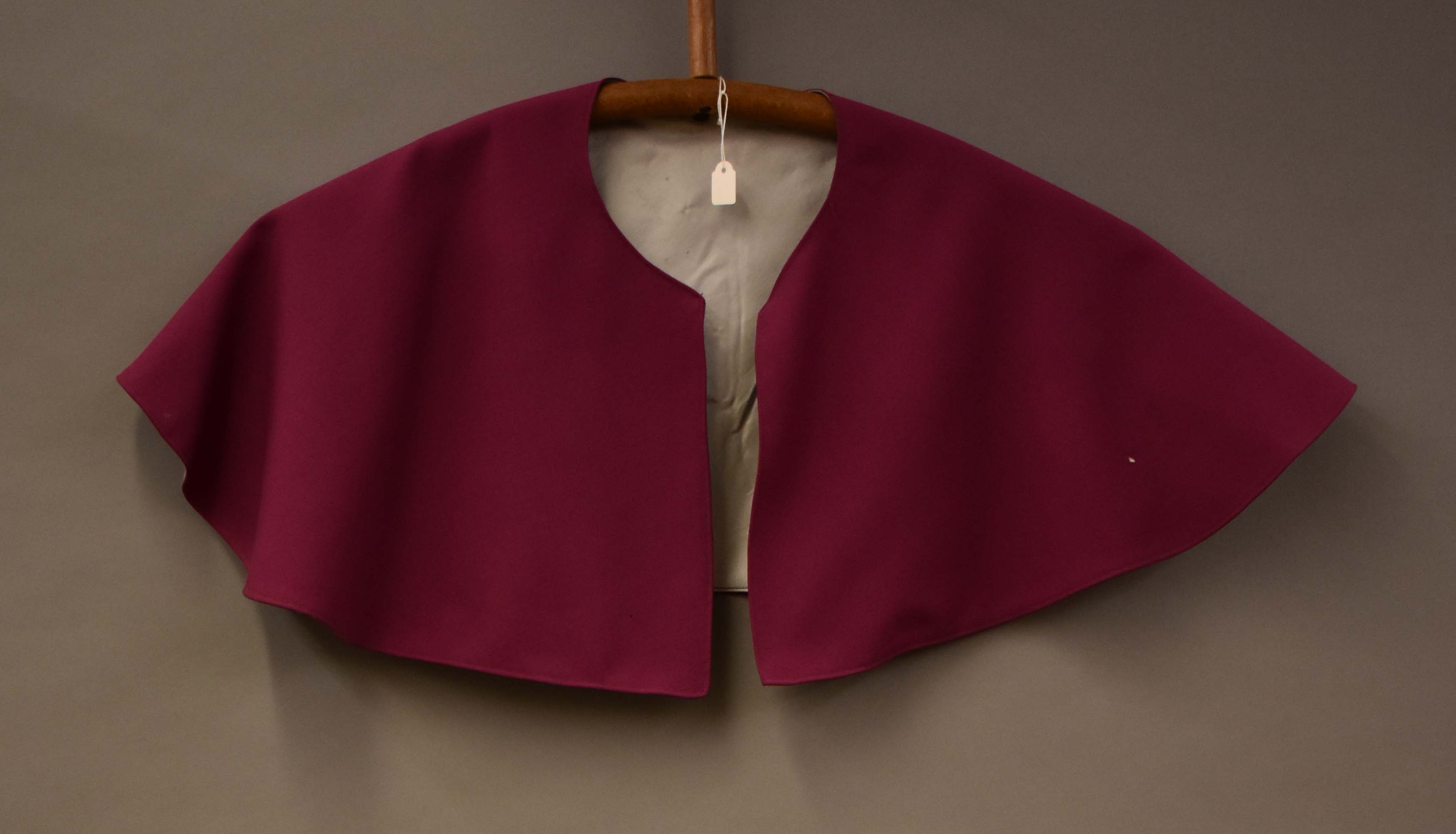 Zwarte schoudermantel met paarse rand en voering, onderdeel van 'klein paars'