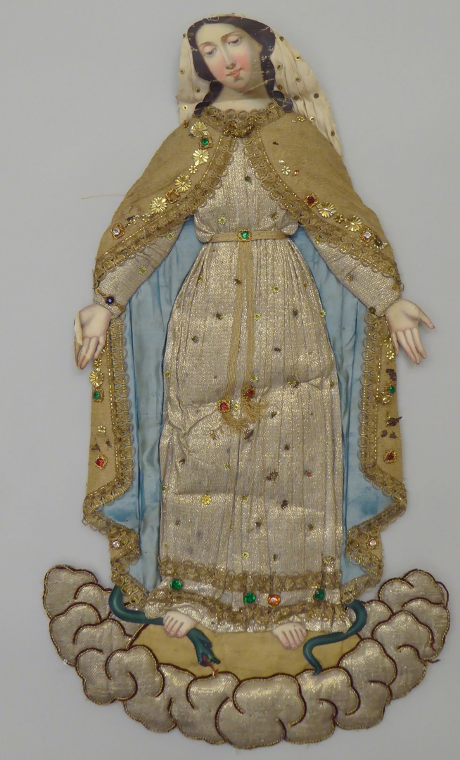 Borduursel van ballustradebekleding: Maria met haar voeten de slang vertrappend