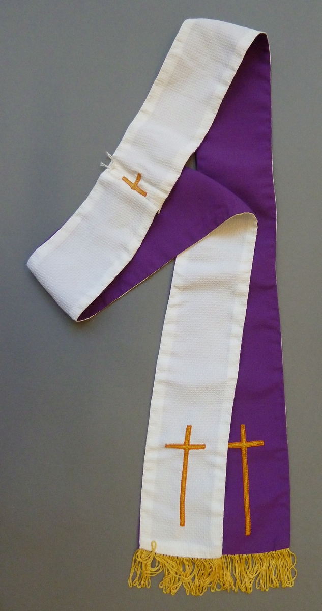 Bedieningsstola met een witte en paarse kant, aan beide zijden geel kruis