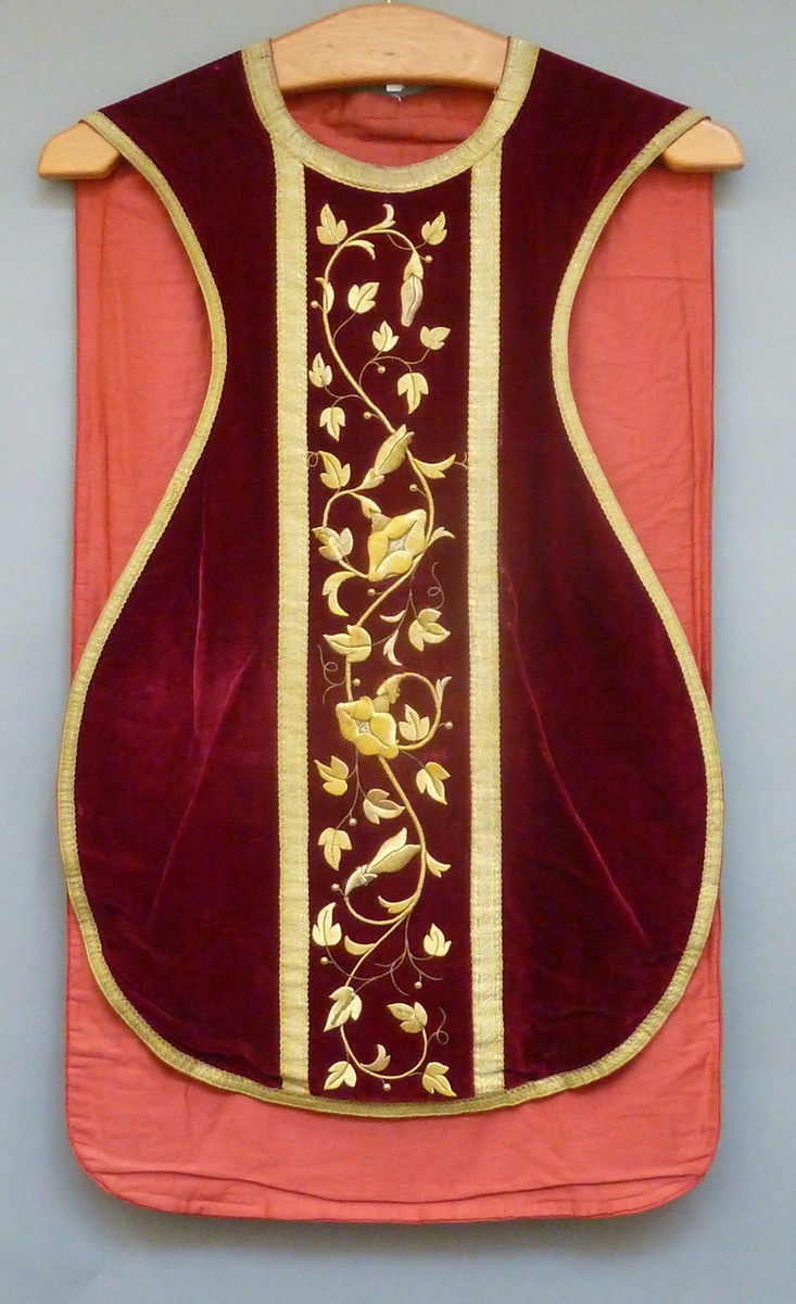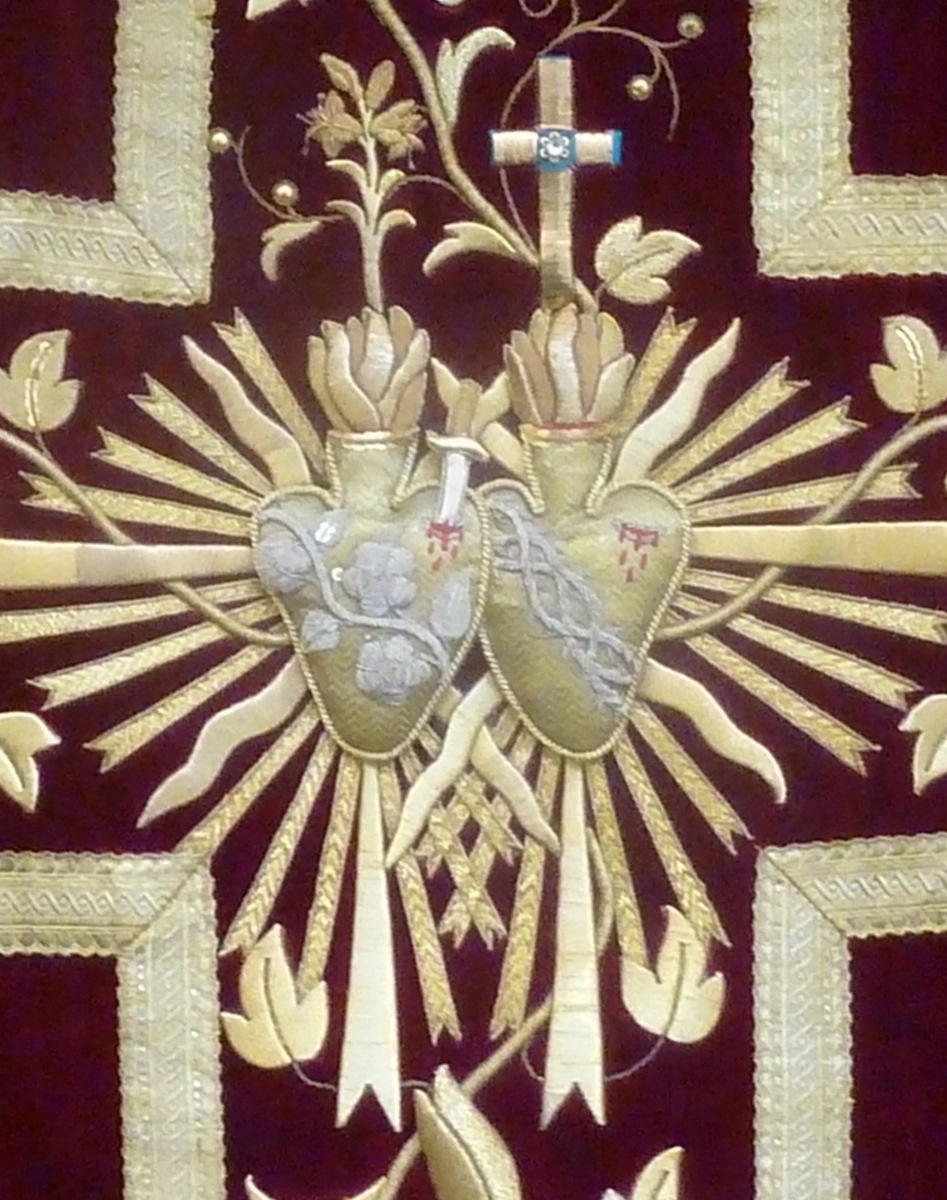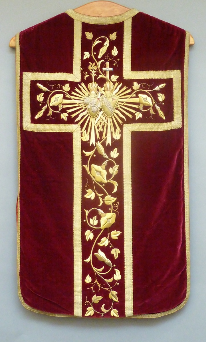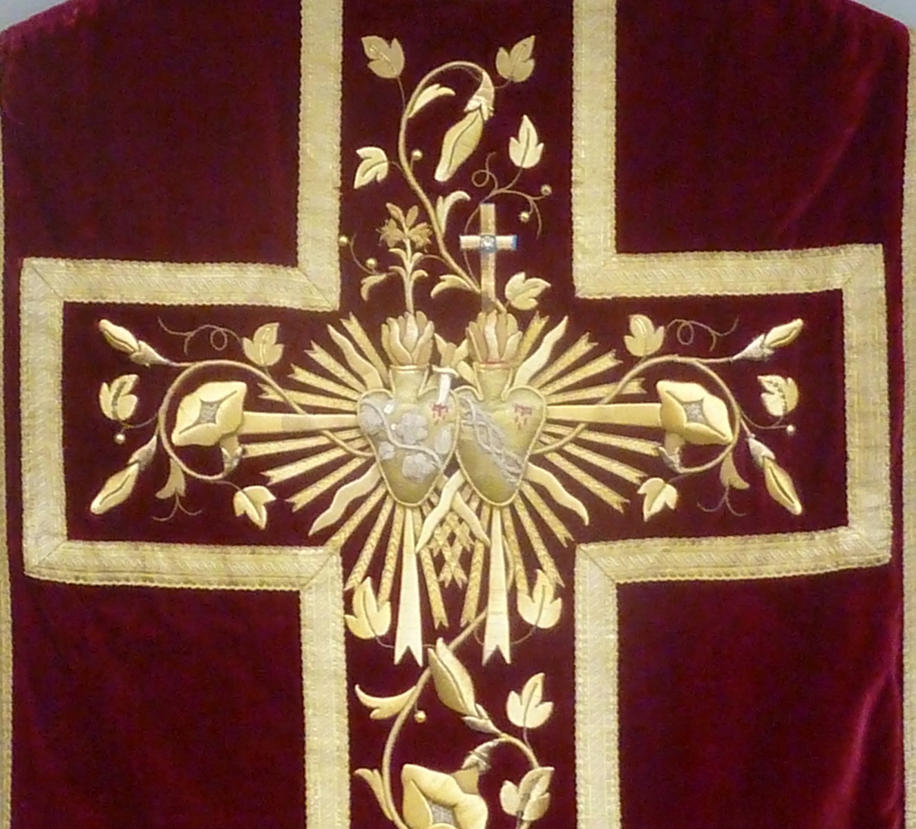 Rood kazuifel in vioolvorm met stralenkrans waarin brandende harten van Maria en Christus