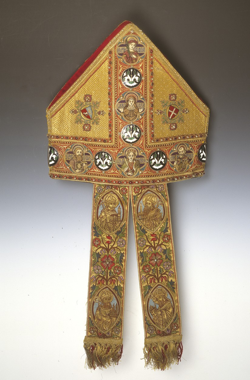Mitra preciosa met o.a. op voorzijde de wapens van Mgr. Petrus Mathias Snickers en het Utrechts Domkapittel, op achterzijde de wapens van Schaepman en het Aartsbisdom