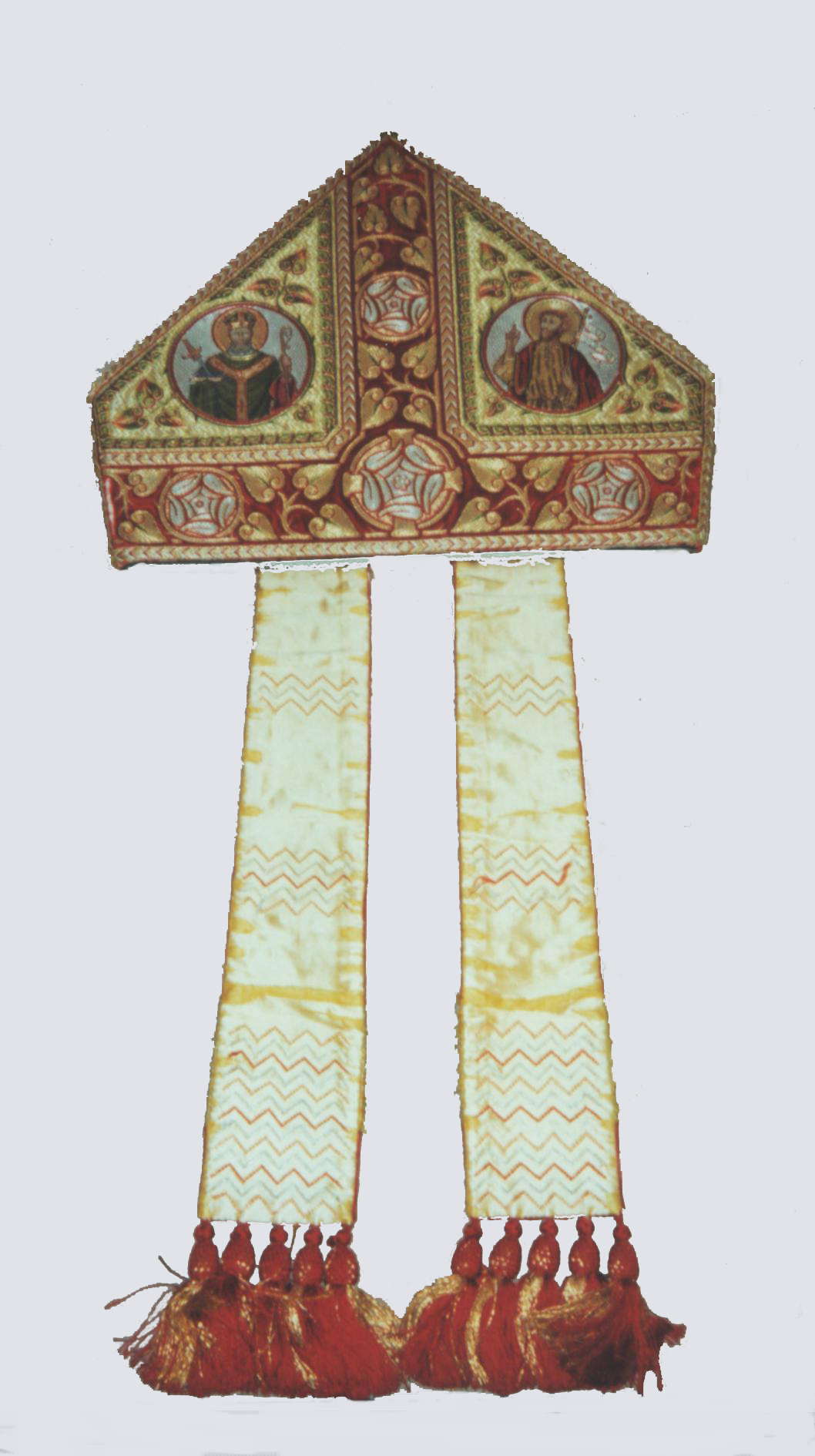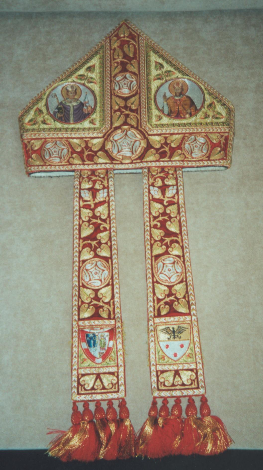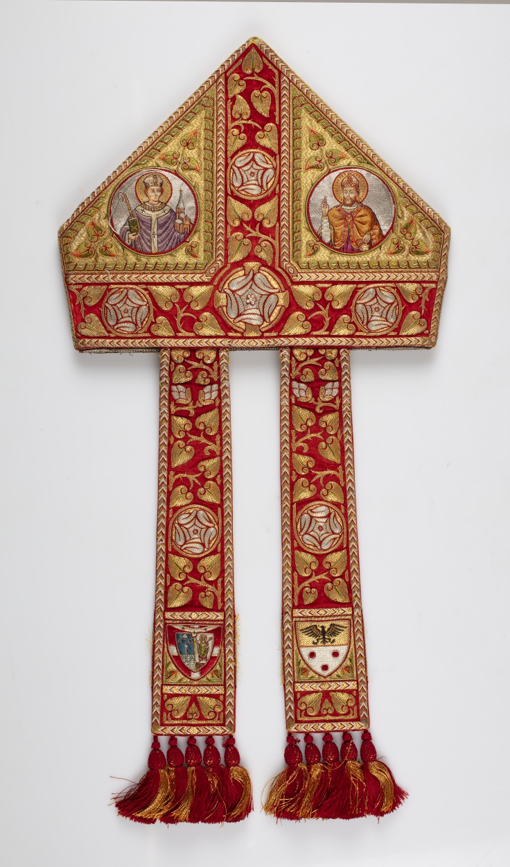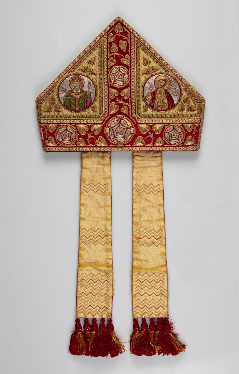 Mitra preciosa met rode hoofd- en middenband en vier heiligen, op rode linten de wapens van Mgr. Joannes Henricus Gerardus Jansen en paus Pius XI, behorend bij ABM t2833