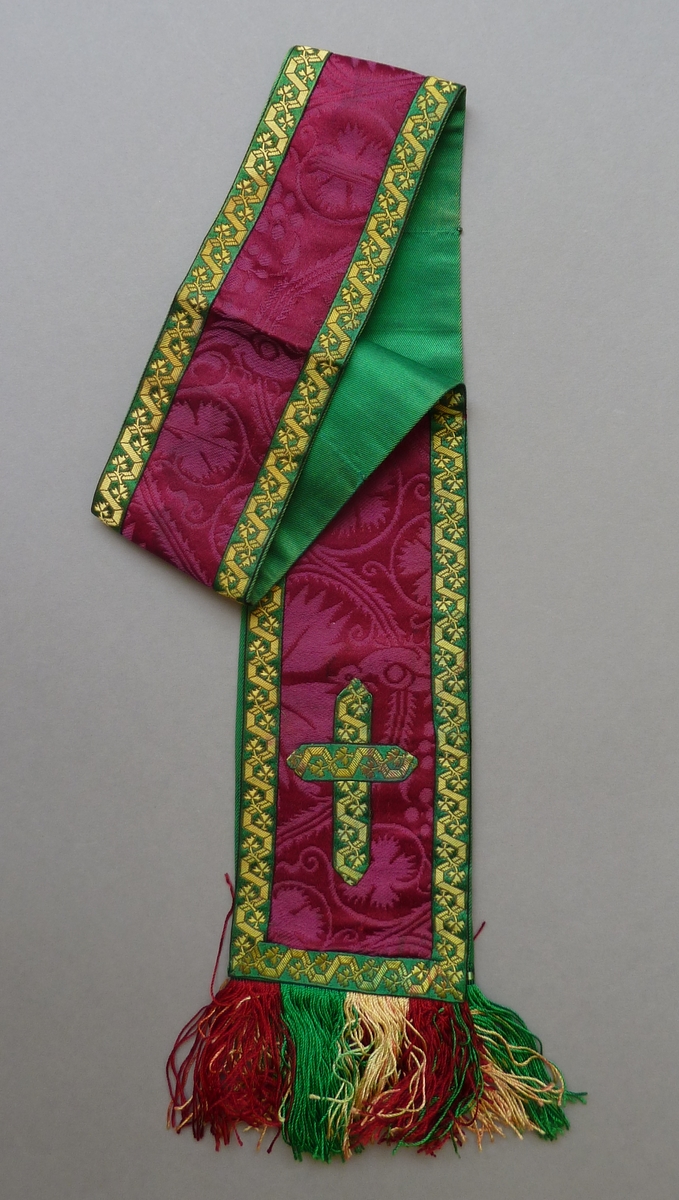 Paarse manipel met ingeweven druivenranken en geel-groen galonkruisje en rand met kleurige franje