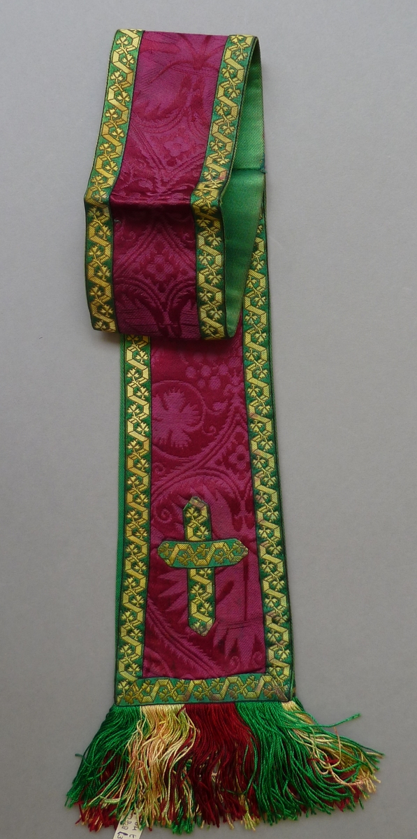 Paarse manipel met ingeweven druivenranken en geel-groen galonkruisje en rand met kleurige franje