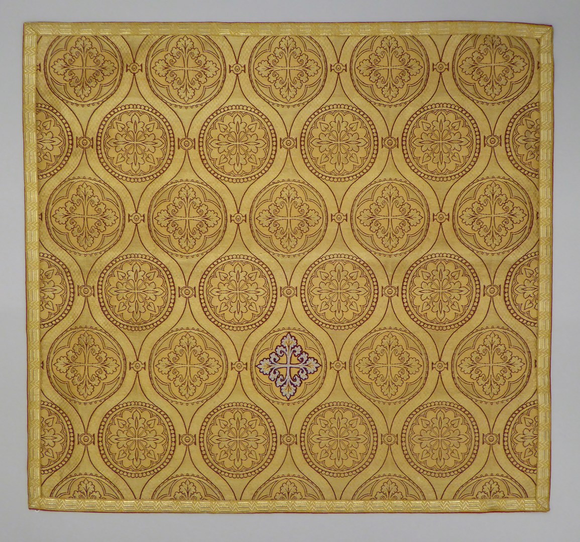 Goudkleurig kelkvelum met rode ingeweven leliekruisen, zilveren leliekruisje