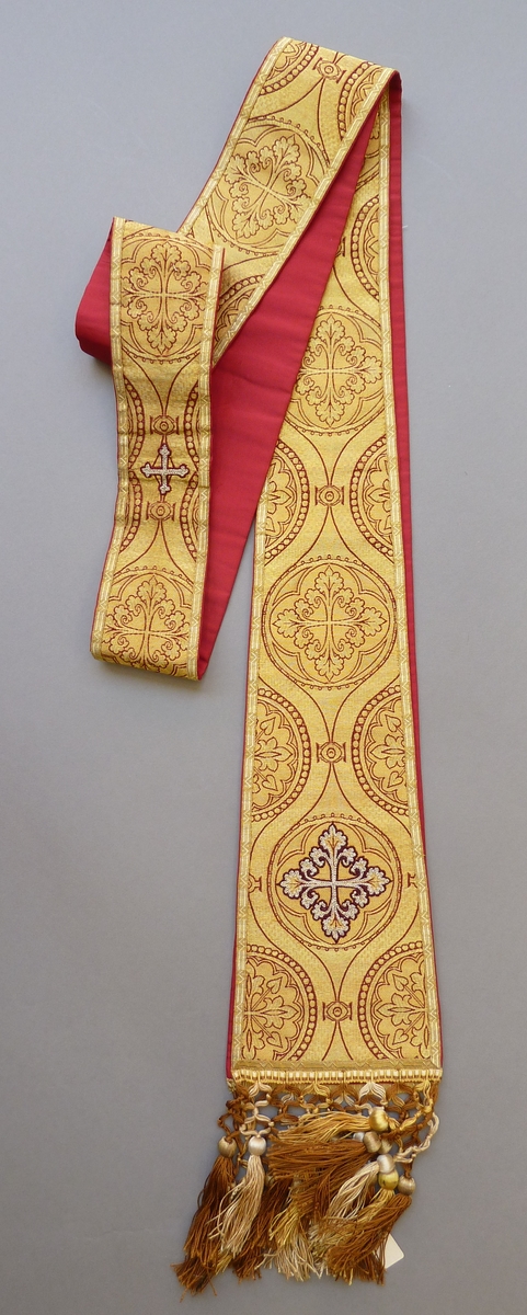 Goudkleurige stola met ingeweven rode vierpassen, leliekruisen van zilverdraad