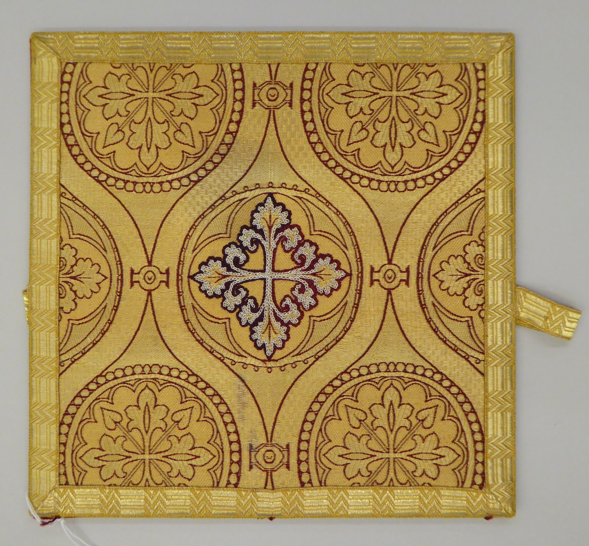 Goudkleurige beurs met rode leliekruisen in medaillon, leliekruis van zilverdraad