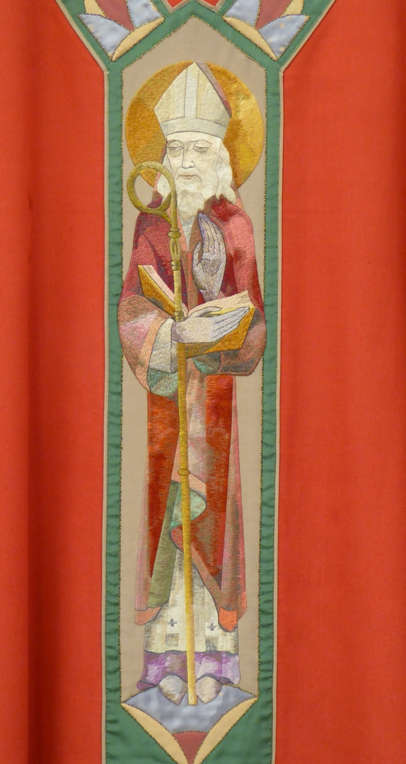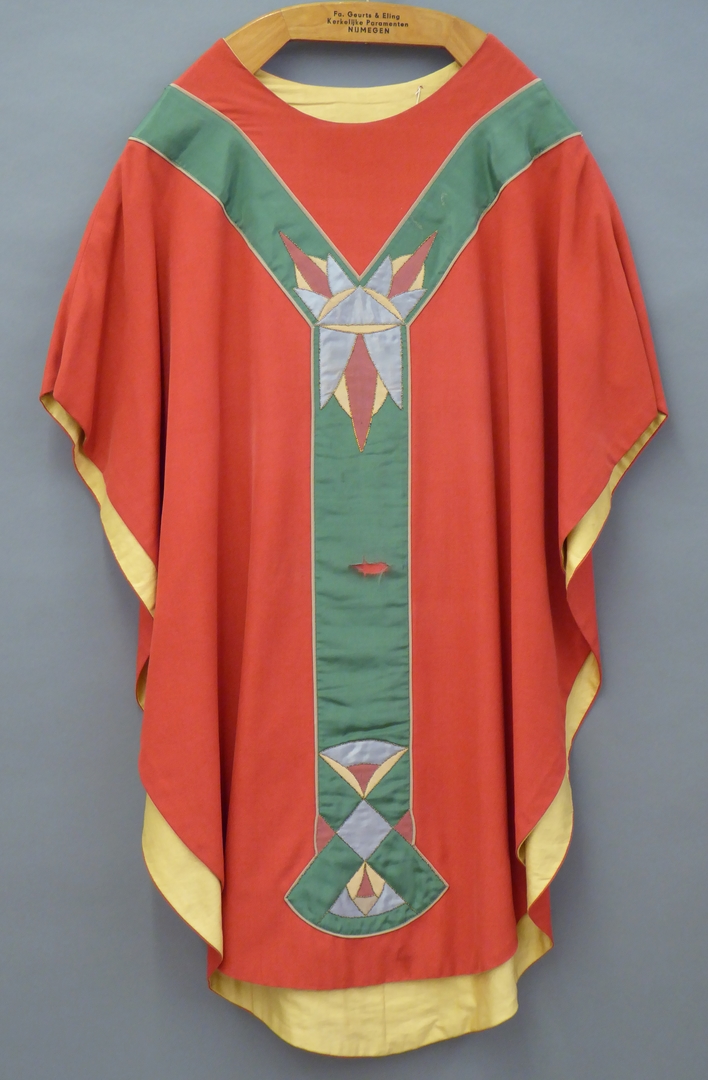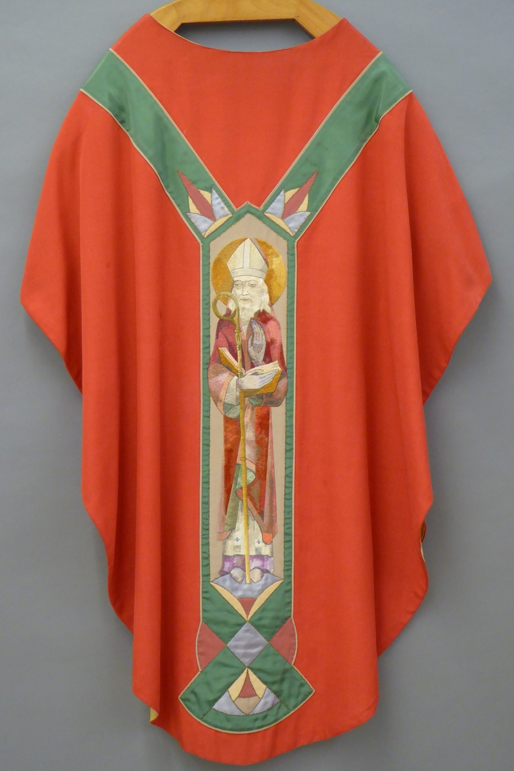Rood kazuifel met groen gaffelkruis en bisschop (Willibrordus?)