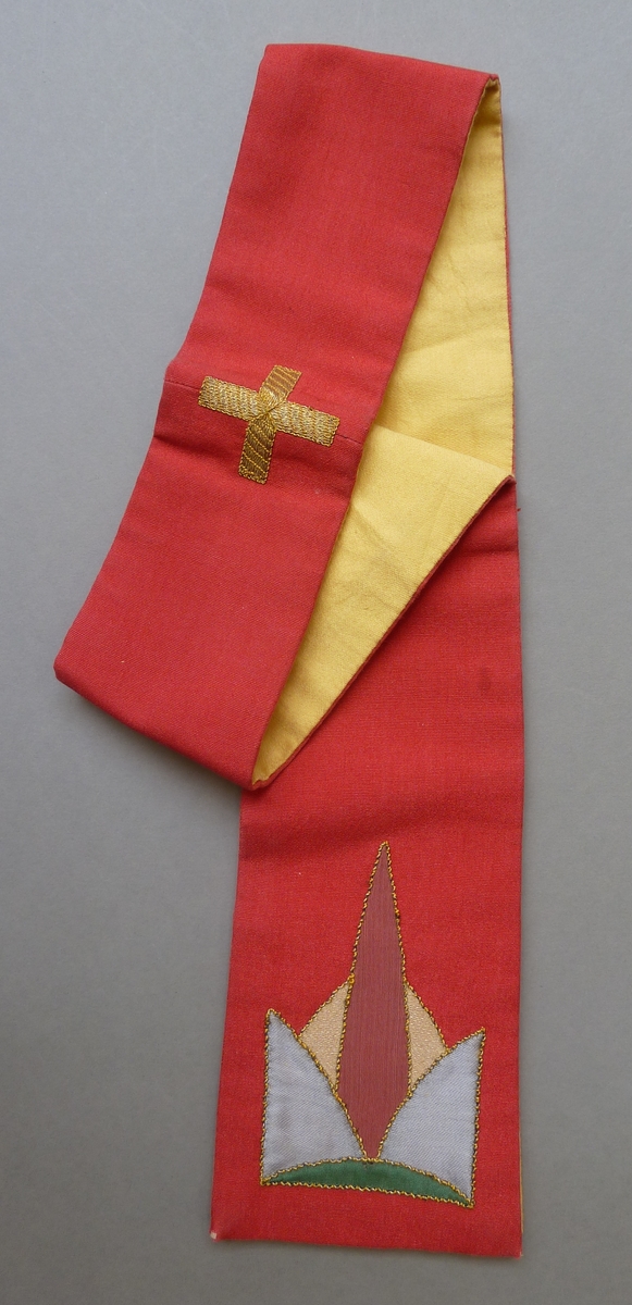 Rode manipel met applicatie in grijs, rood, geel, groen