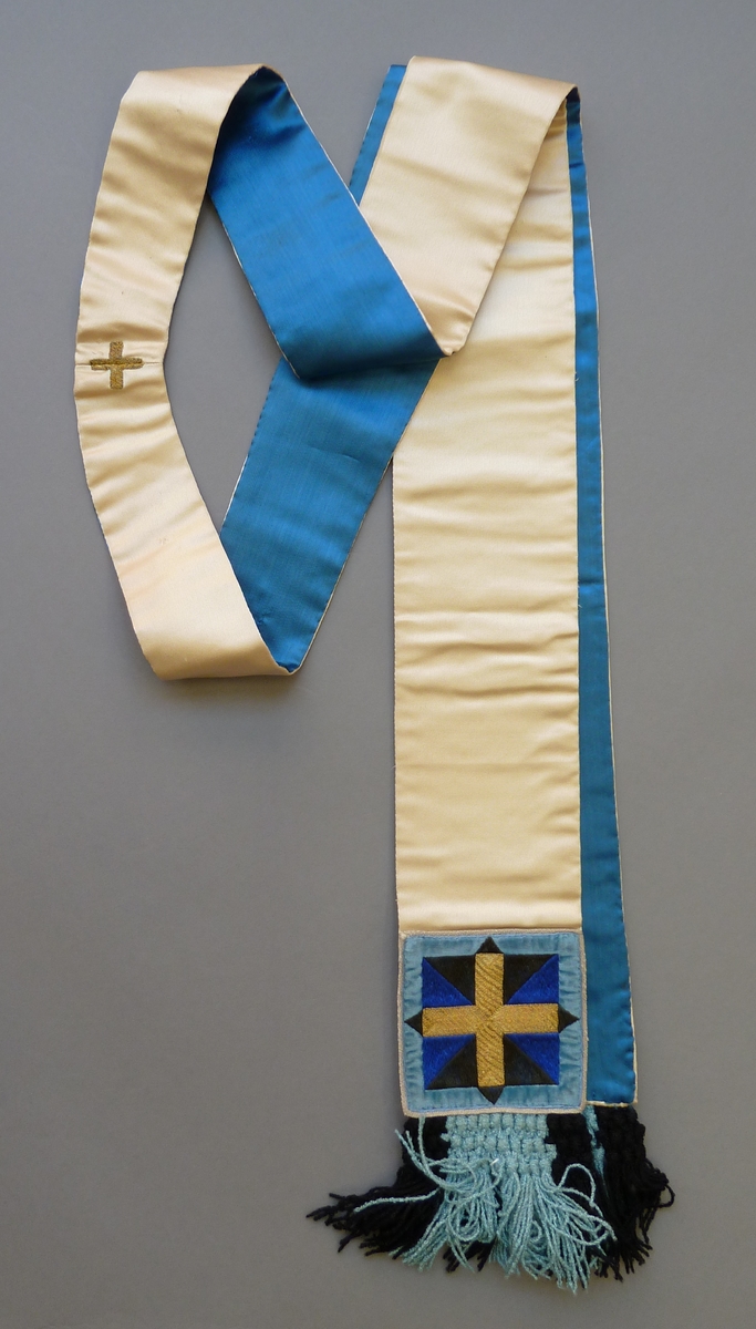 Witte stola met kruis van gouddraad op blauwe ondergrond