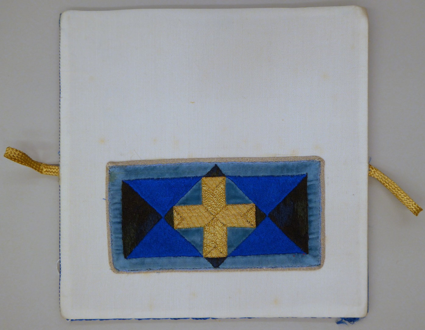 Witte beurs met kruis van gouddraad op blauwe ondergrond