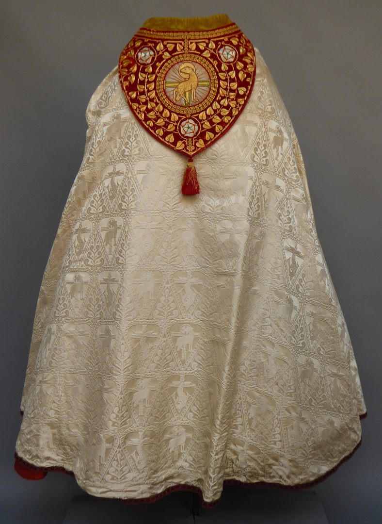 Witte koorkap met ingeweven lam en vis, borduurwerk Lam Gods