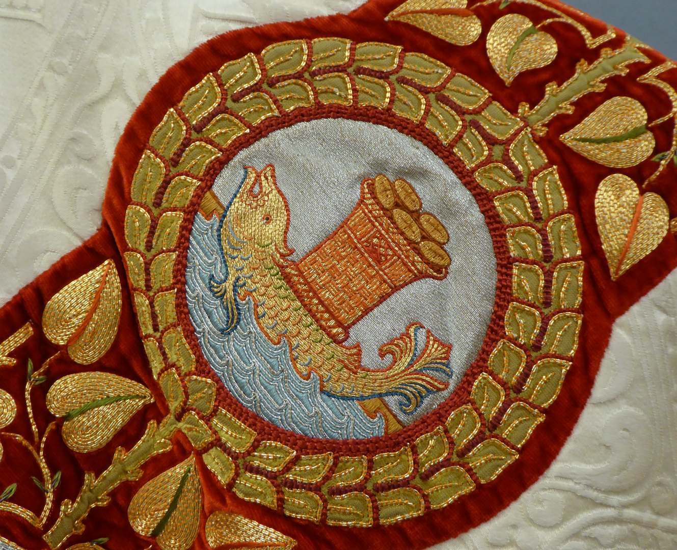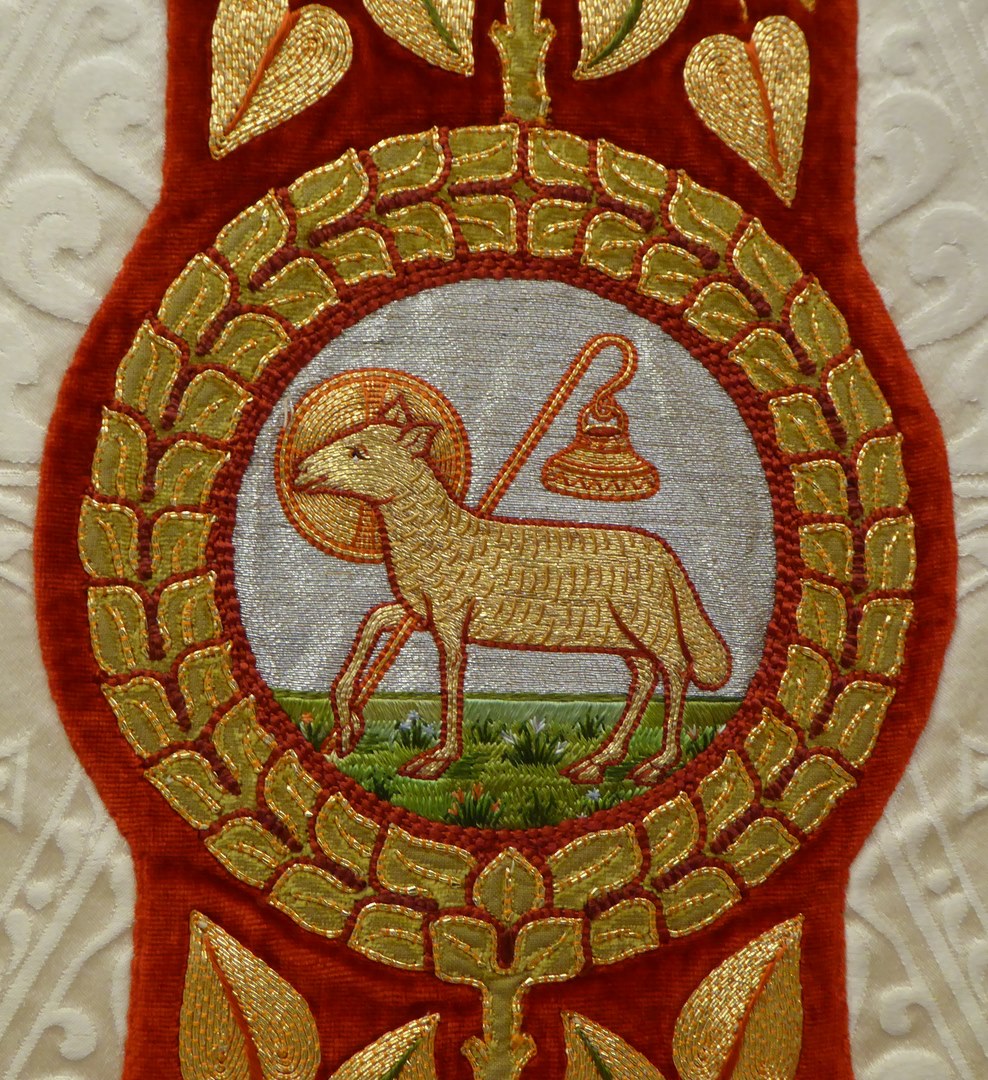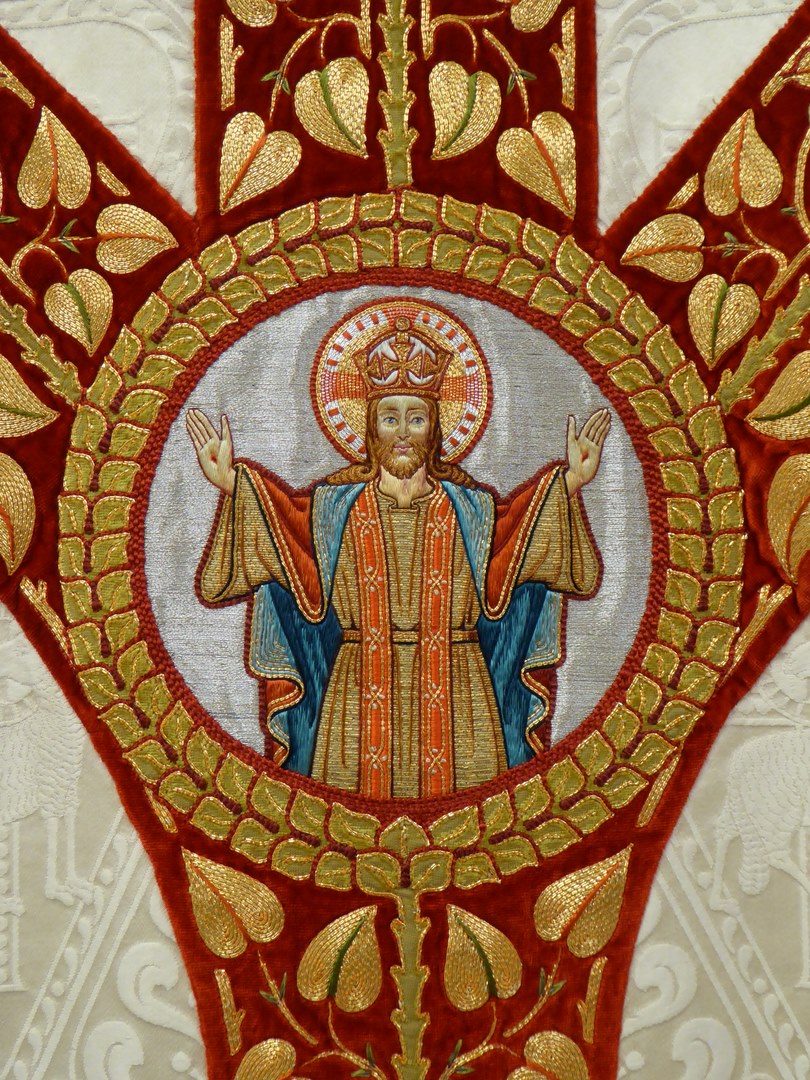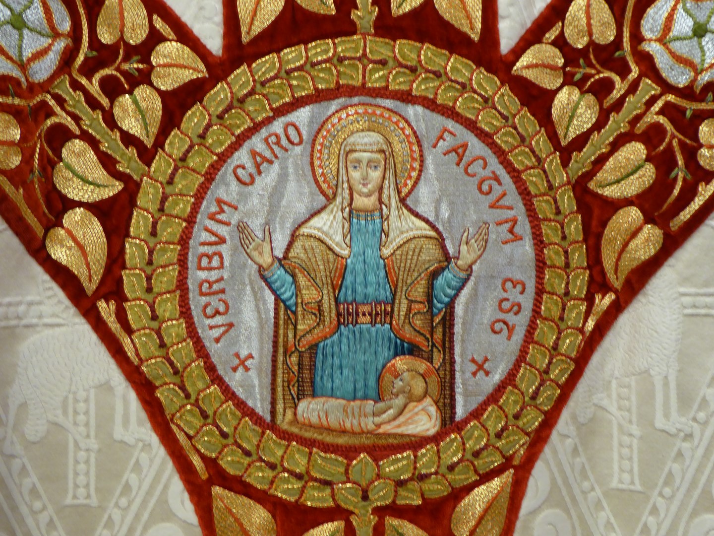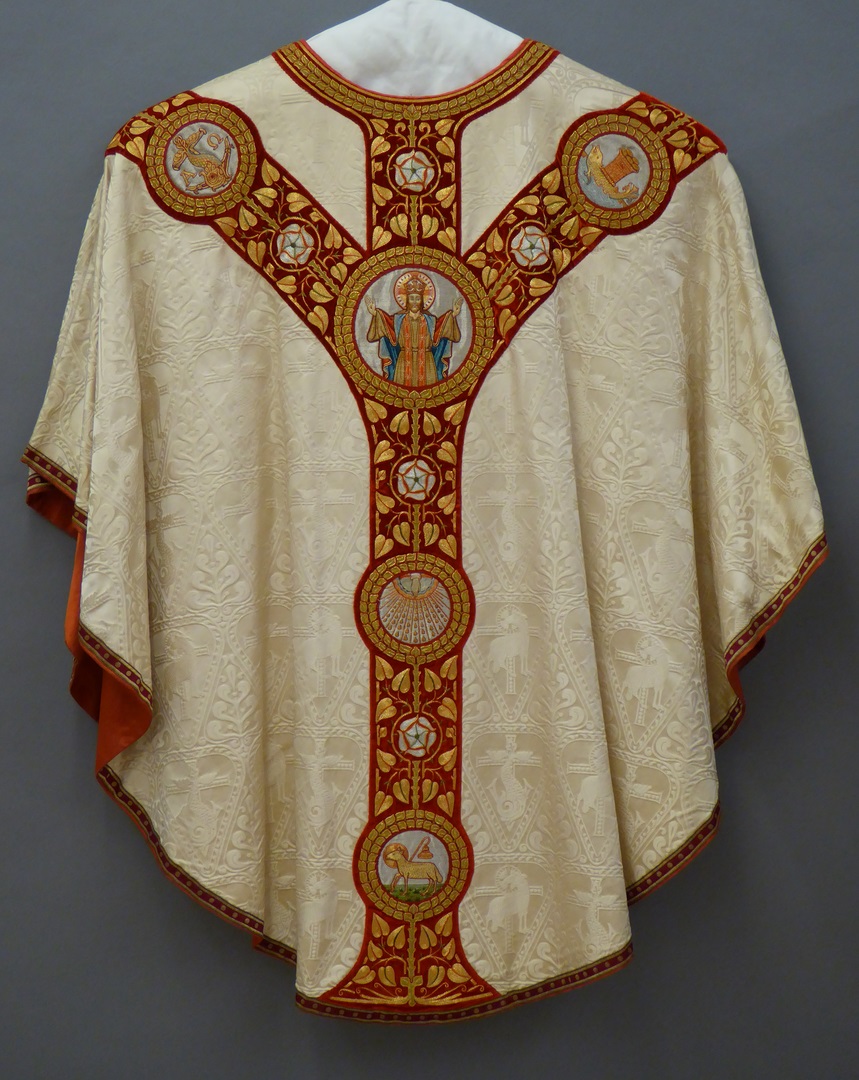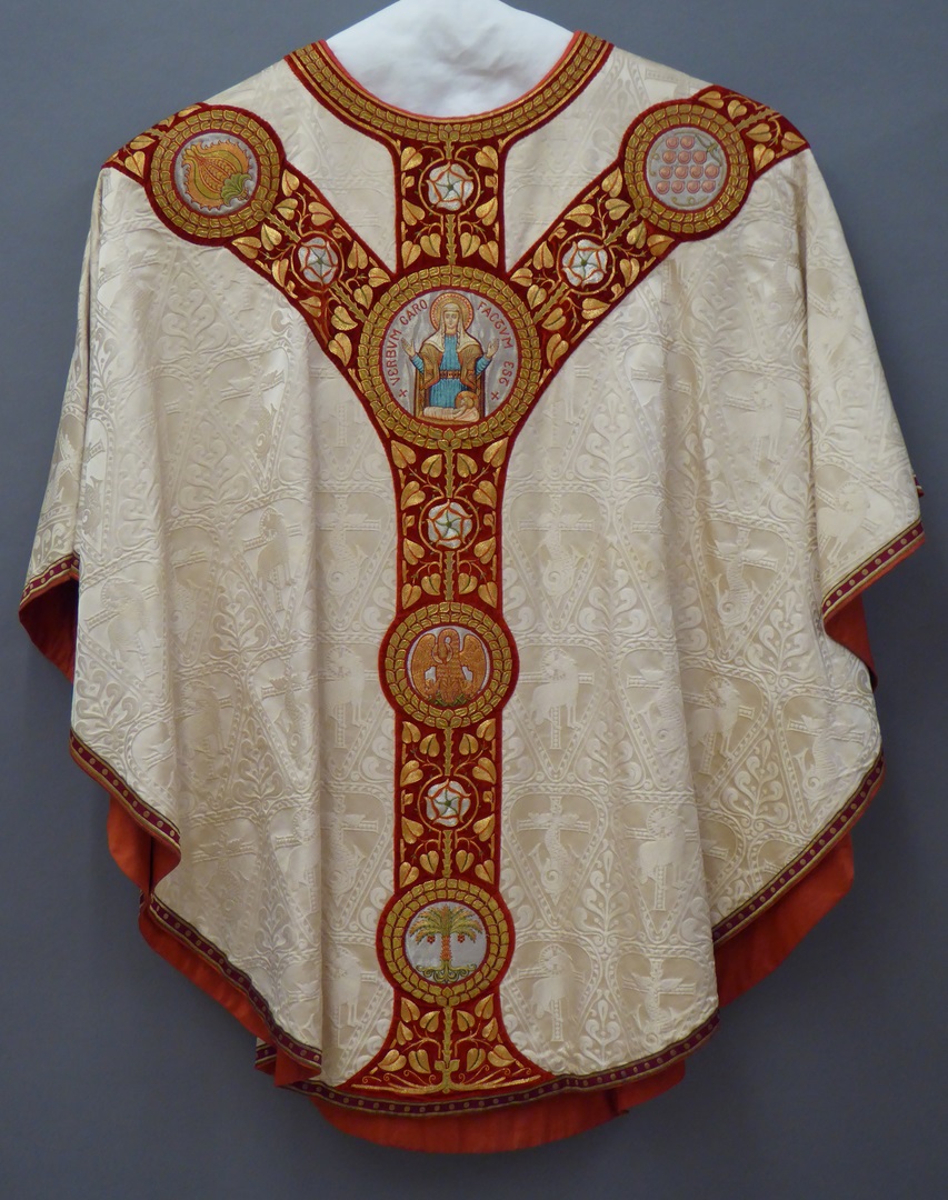 Wit kazuifel met ingeweven lam en vis, borduurwerk Christus Koning, Maria met Kind