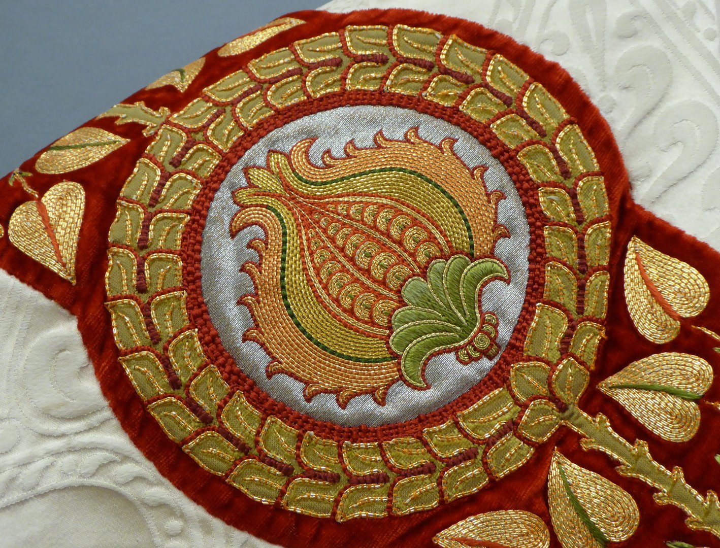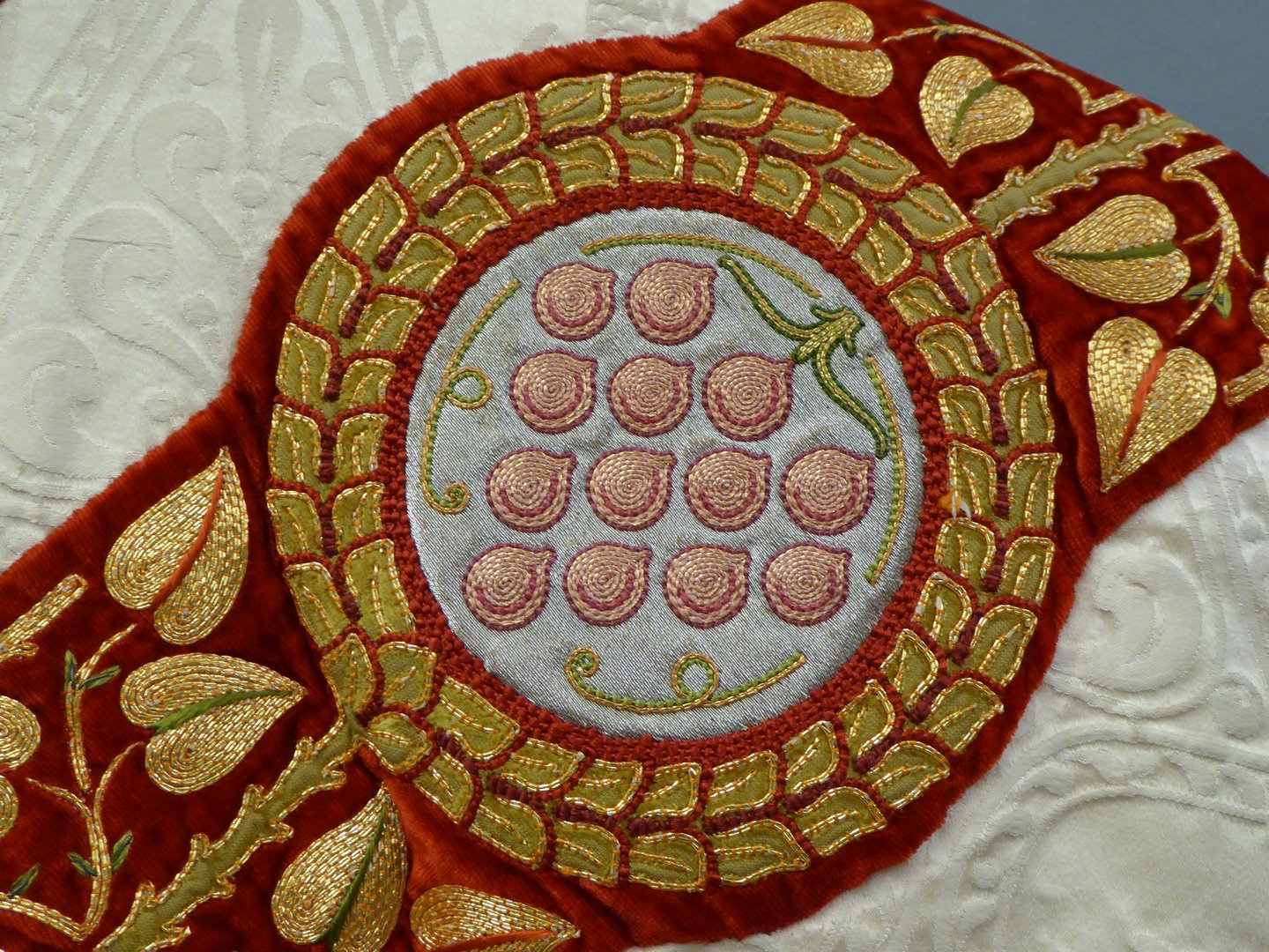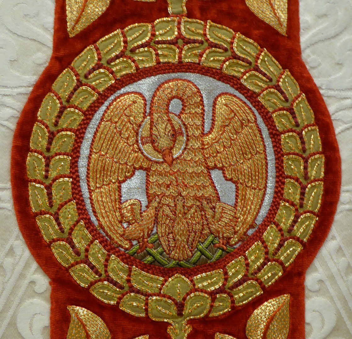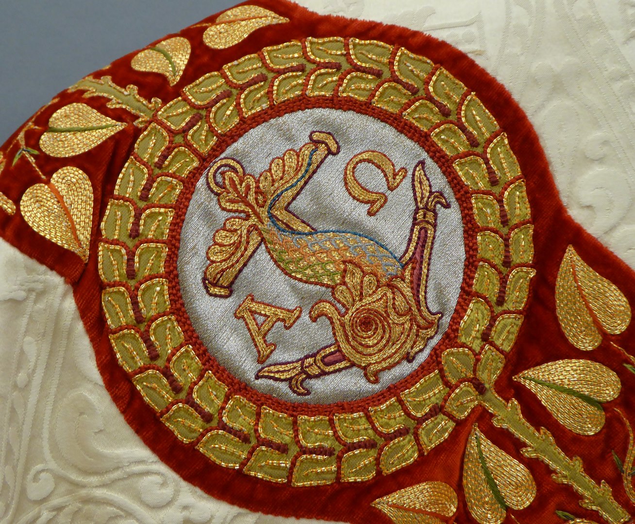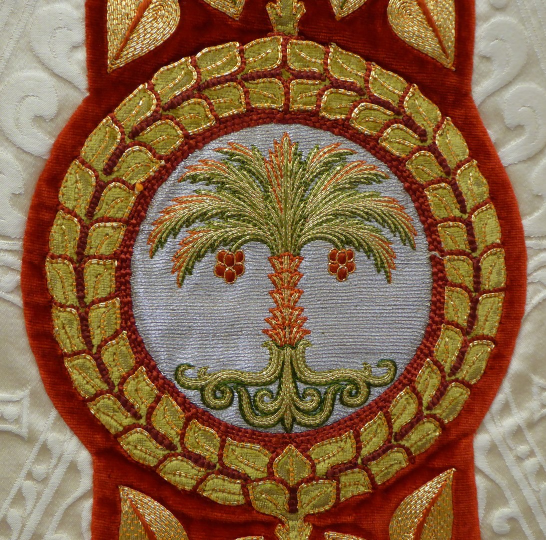 Wit kazuifel met ingeweven lam en vis, borduurwerk Christus Koning, Maria met Kind