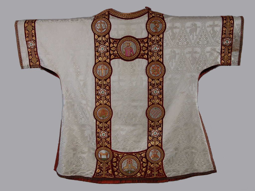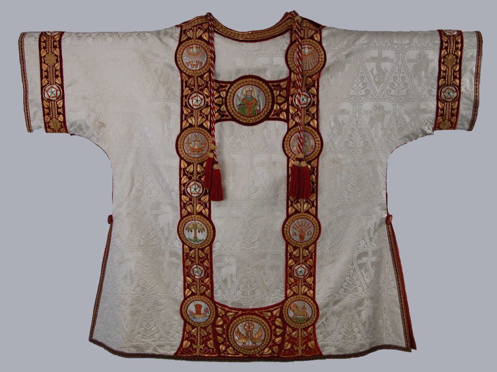 Witte dalmatiek met ingeweven lam en vis, borduurwerk H. Gregorius, bisschop, lammeren enz.