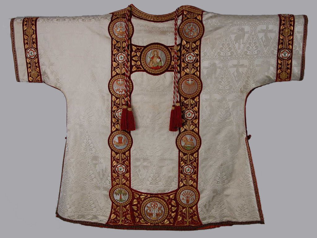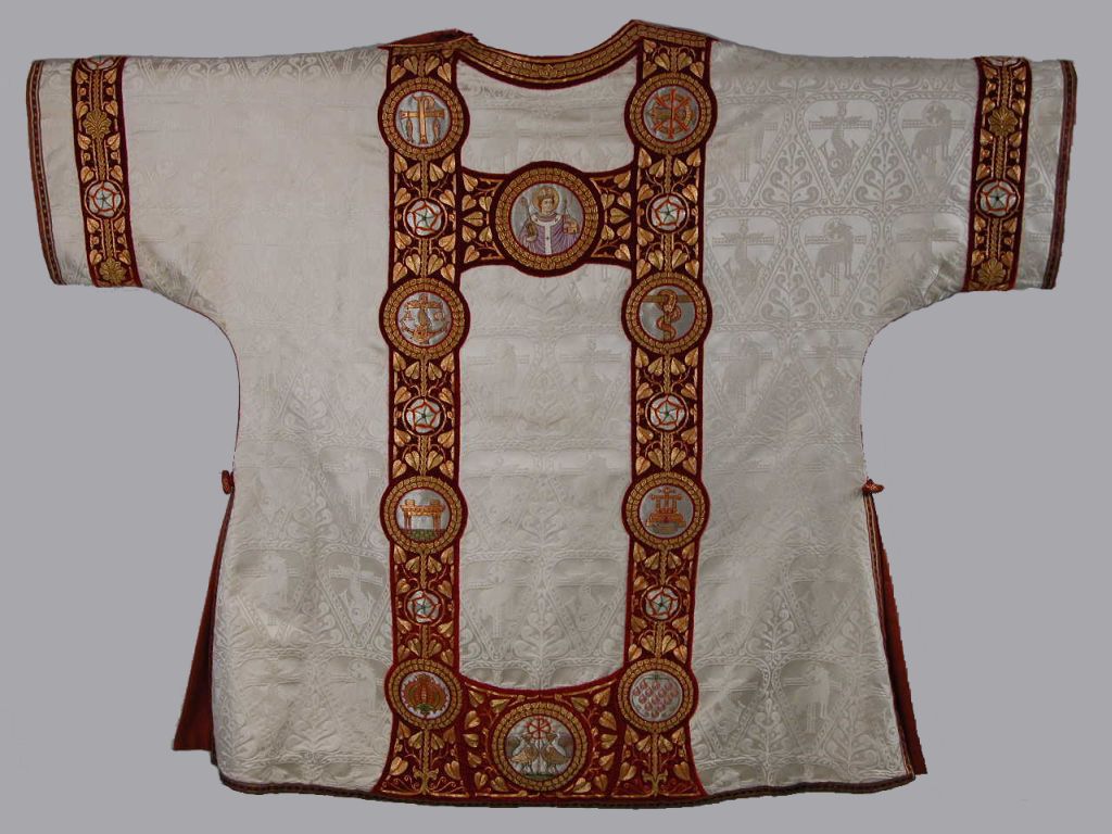 Witte dalmatiek met ingeweven lam en vis, borduurwerk H. Willibrordus en H. Catharina