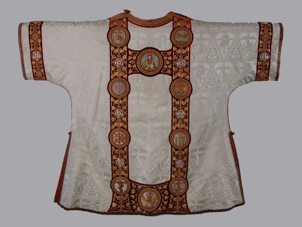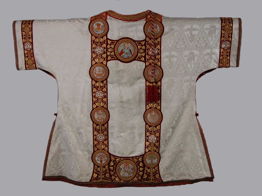 Witte dalmatiek met ingeweven lam en vis, borduurwerk HH. Petrus en Paulus