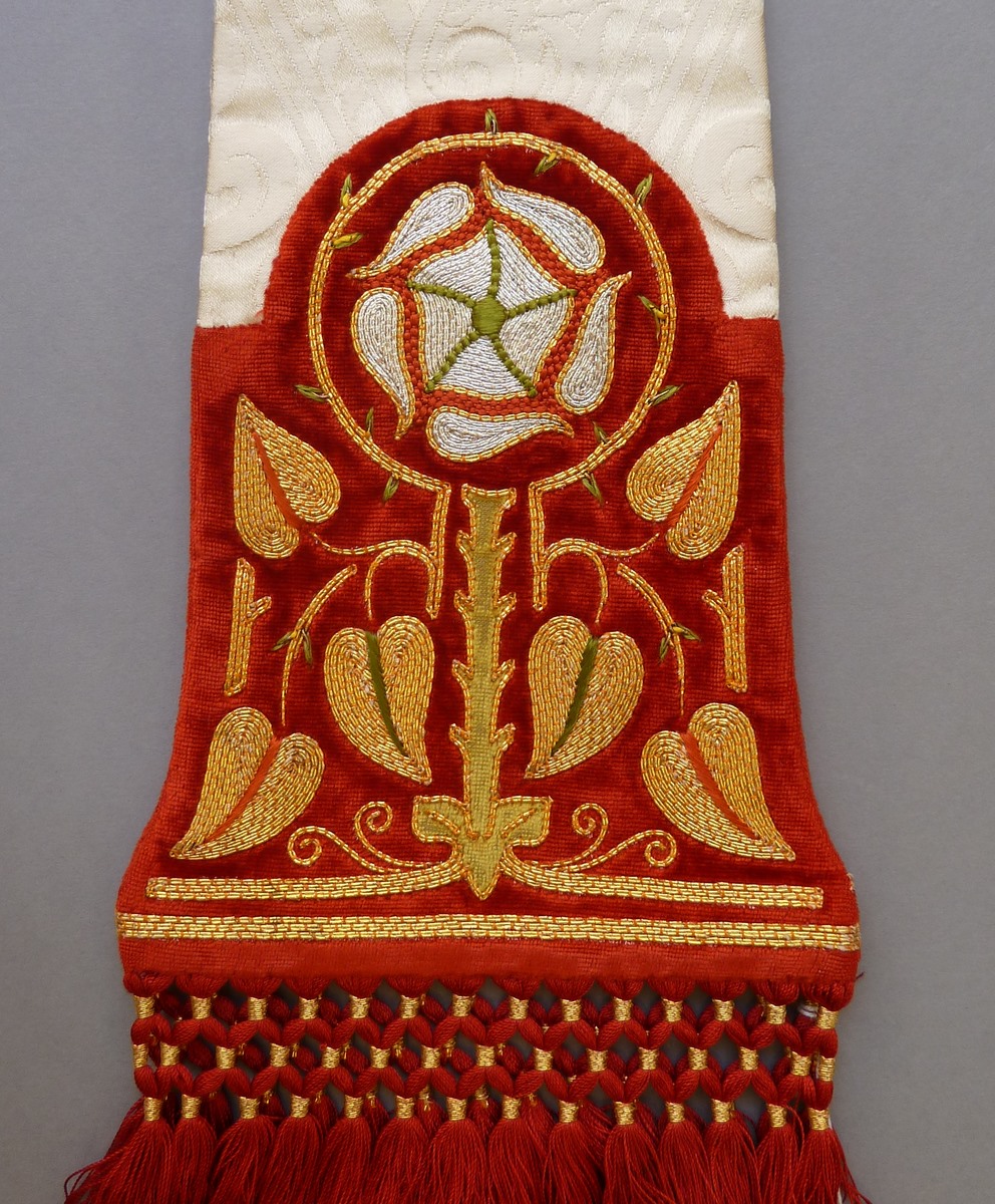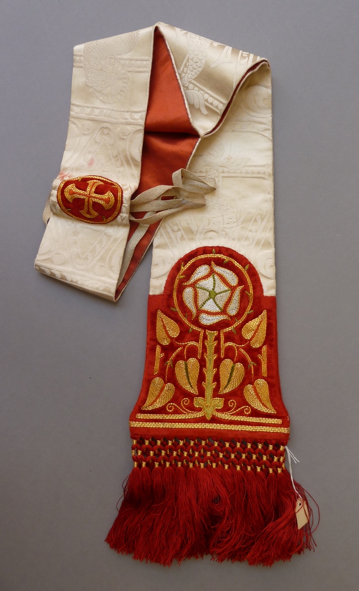 Witte manipel met ingeweven lam en vis; geborduurde roos op rood fluweel