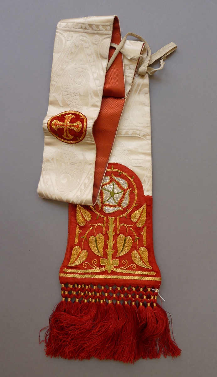 Witte manipel met ingeweven lam en vis; geborduurde roos op rood fluweel