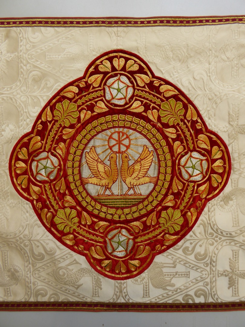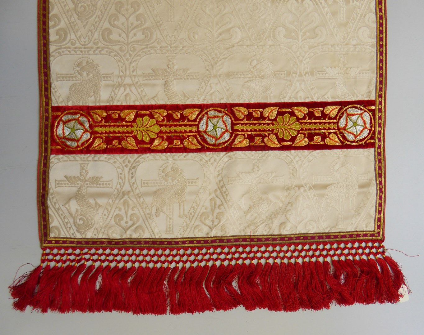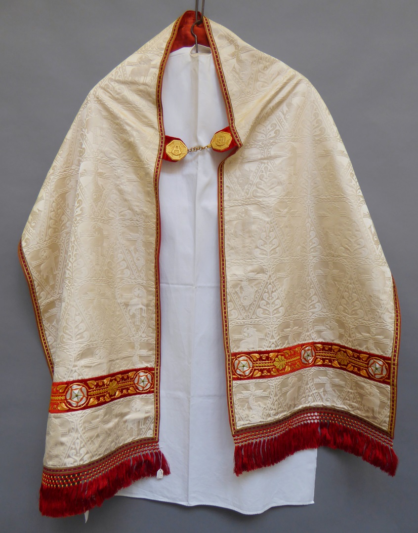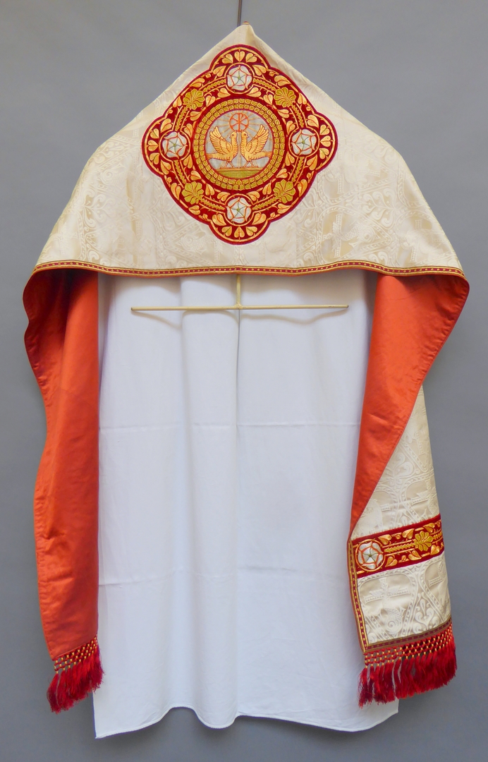 Wit schoudervelum met ingeweven vis en lam, met twee duiven in medaillon
