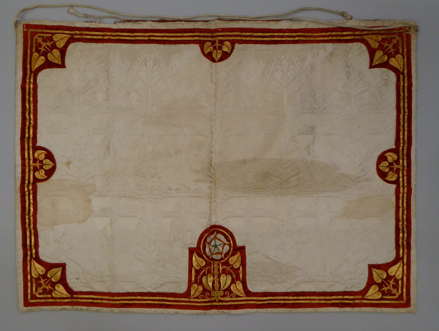 Witte gremiale met ingeweven vis en lam, afgezet met rood fluweel en goudborduurwerk