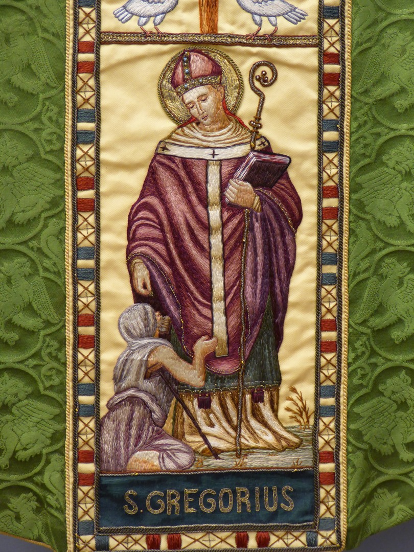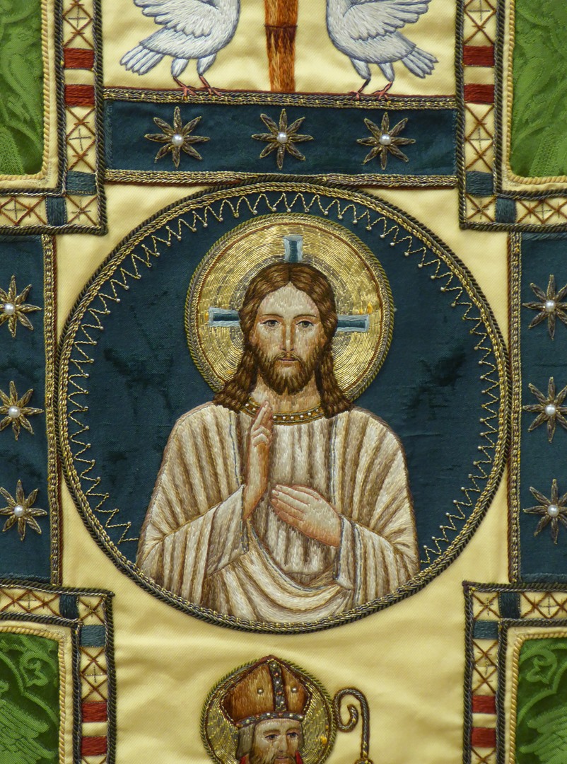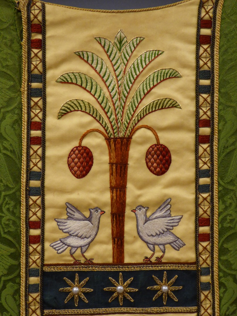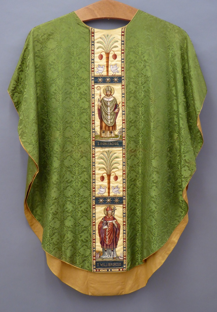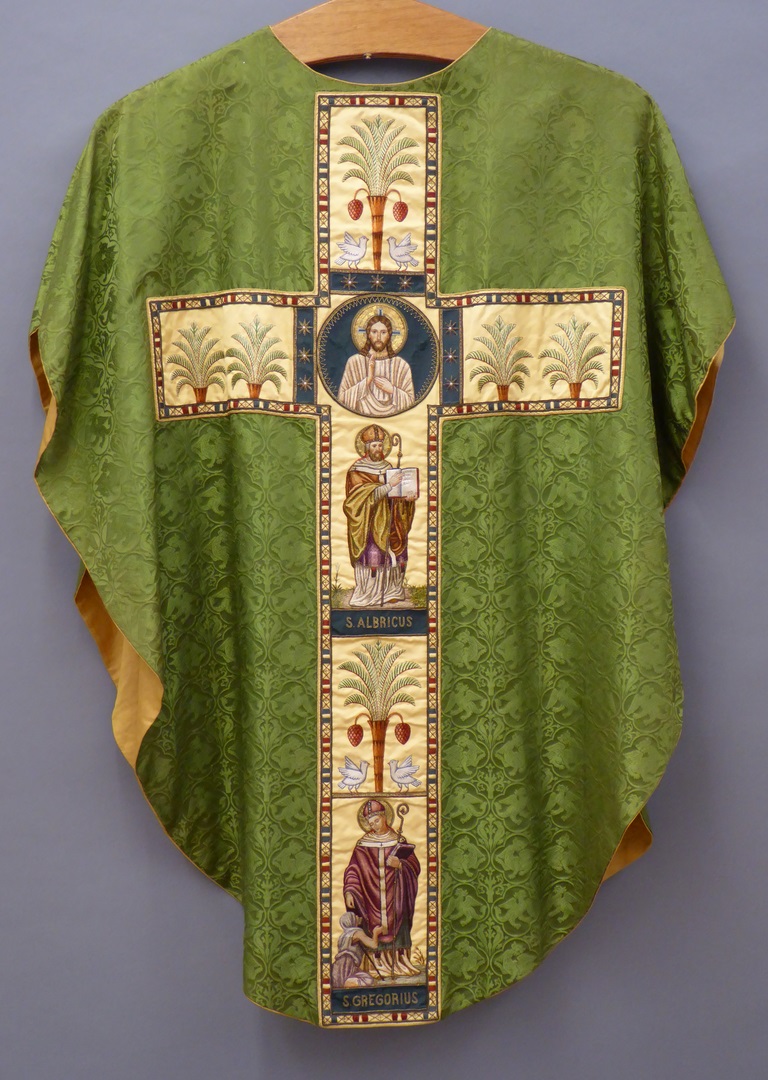 Groen kazuifel met ingeweven griffioenen e.a. in vierpassen en clipeus met zegenende Christus