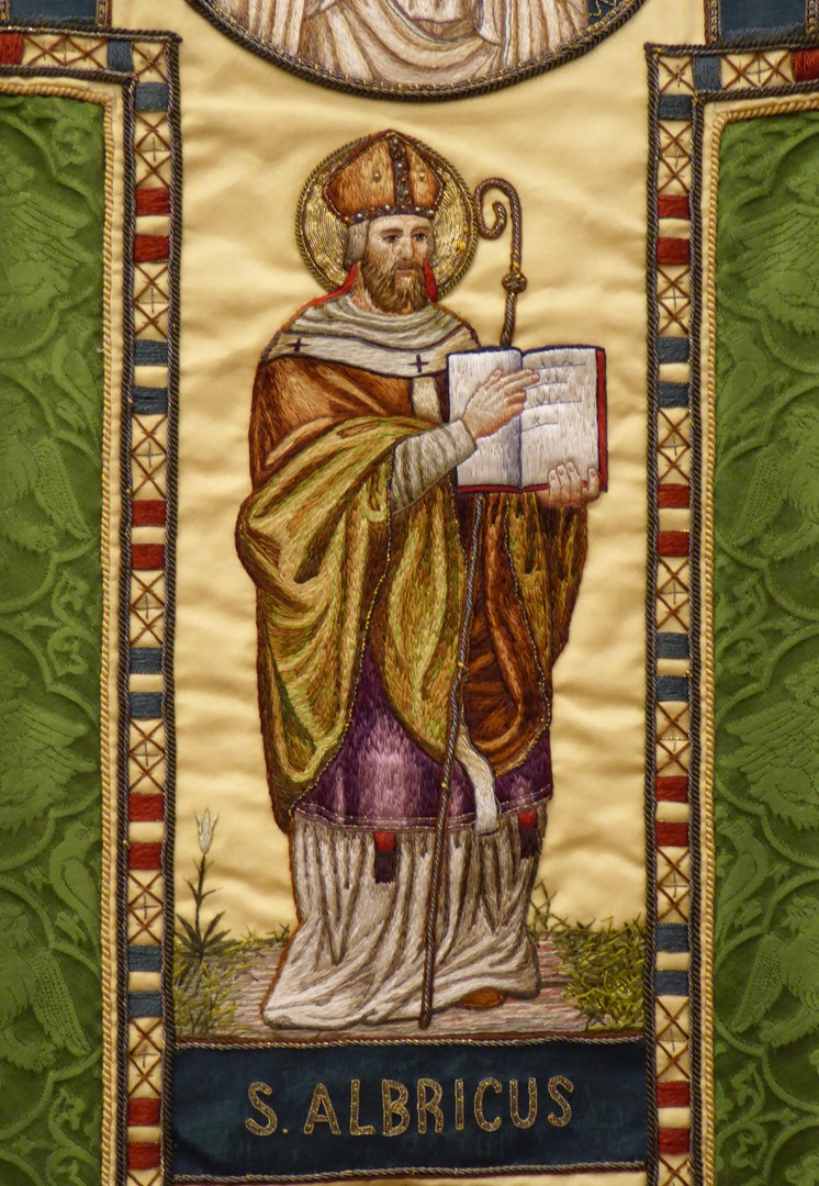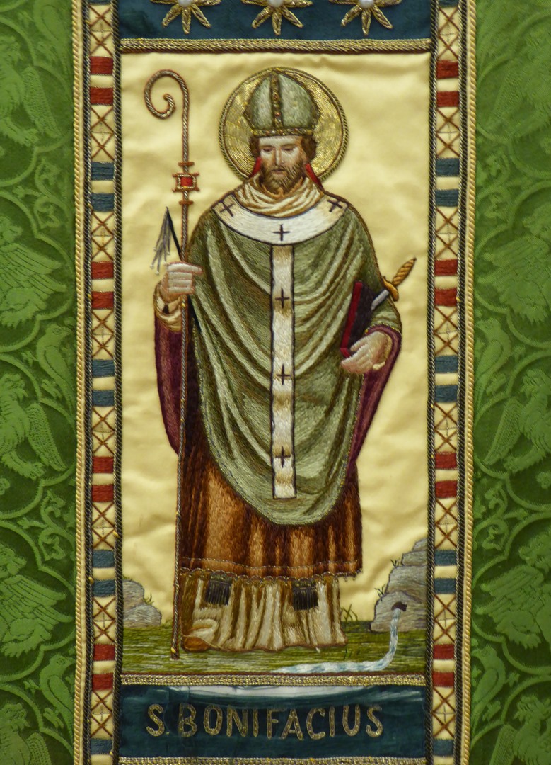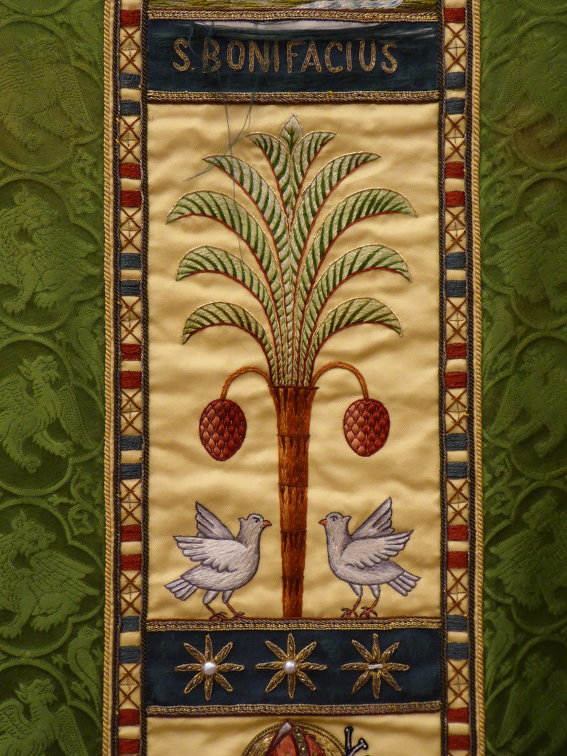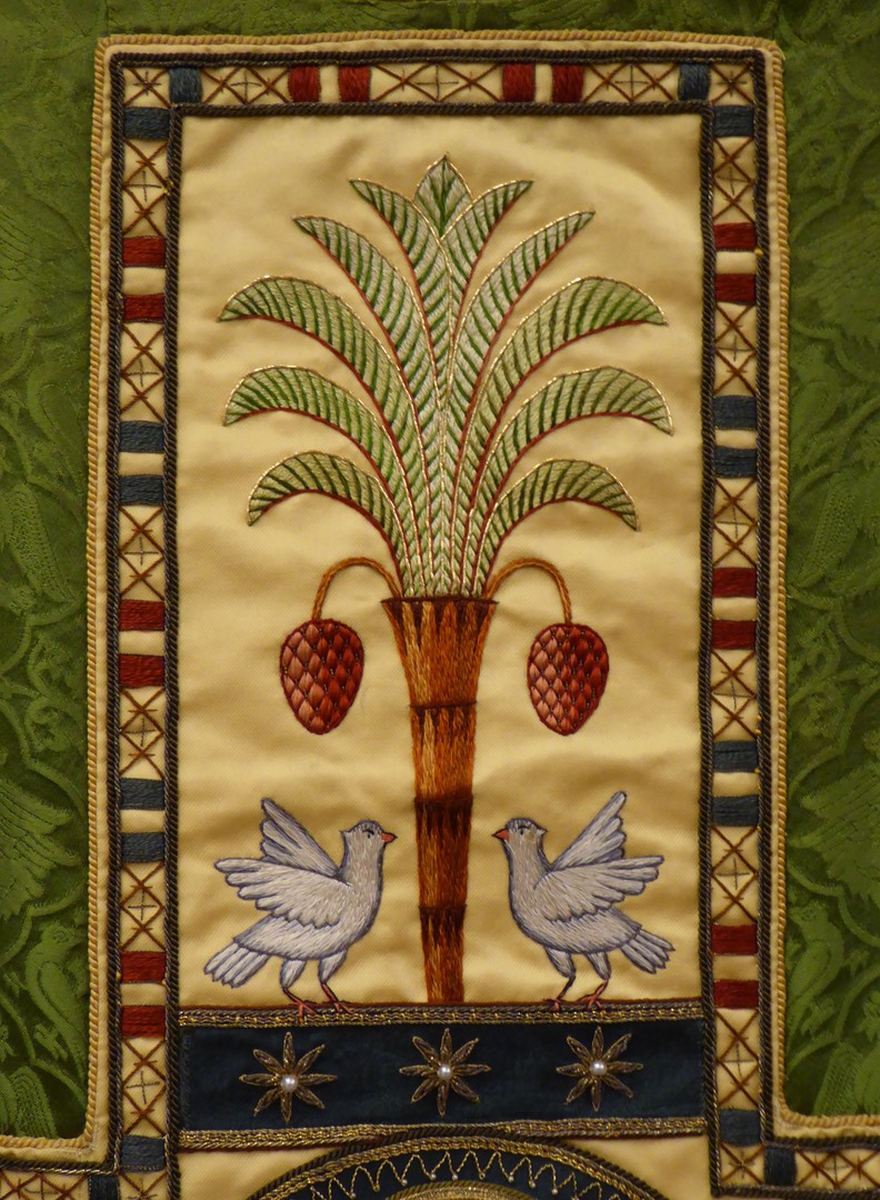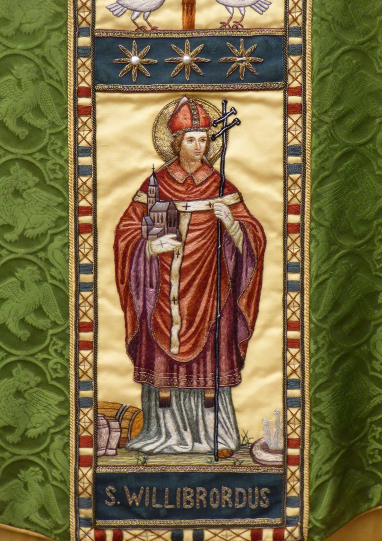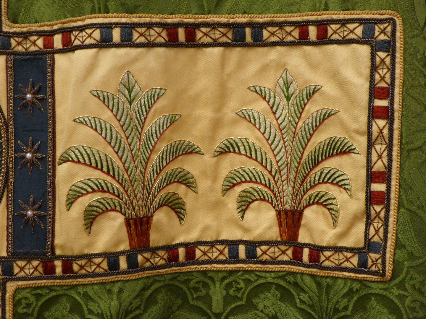 Groen kazuifel met ingeweven griffioenen e.a. in vierpassen en clipeus met zegenende Christus