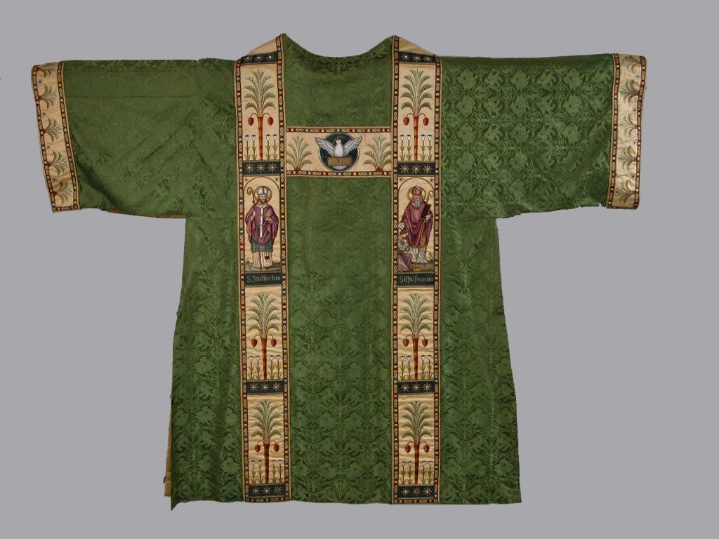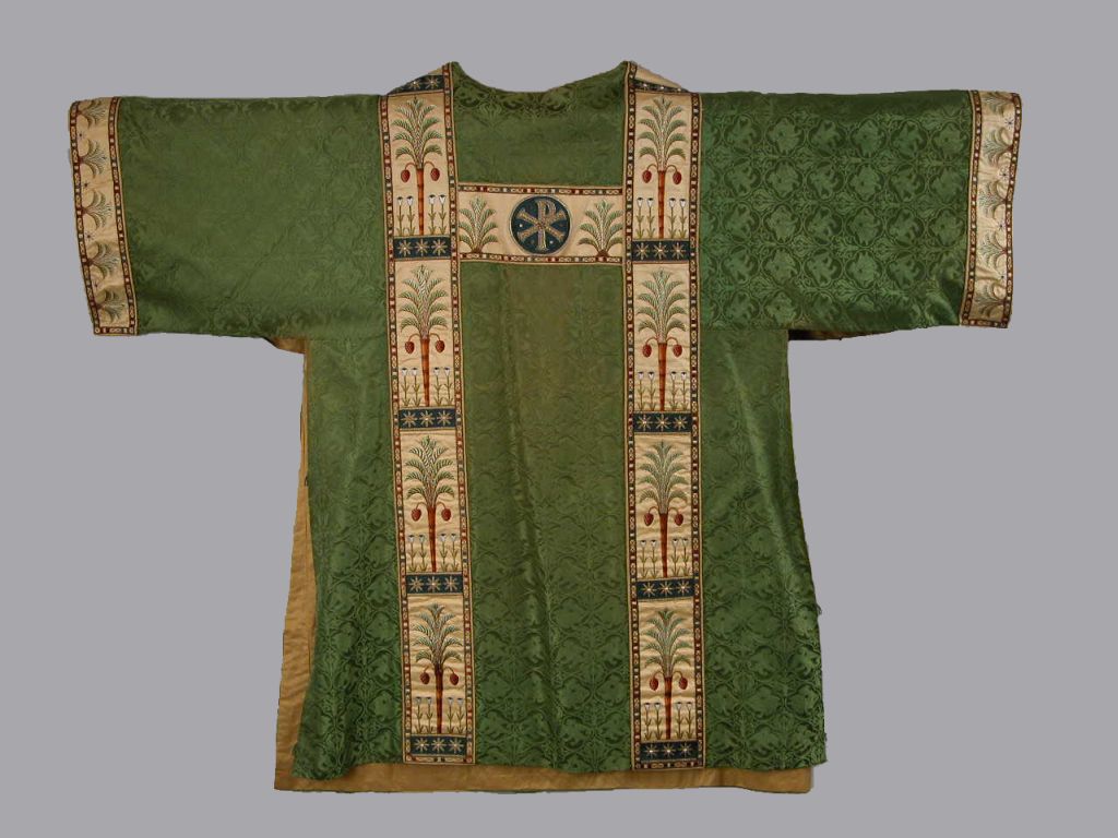 Groene dalmatiek met ingeweven griffioenen e.a. in vierpassen en heiligen
