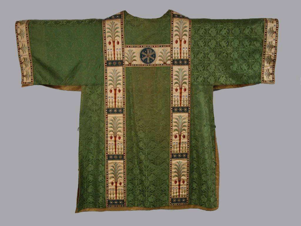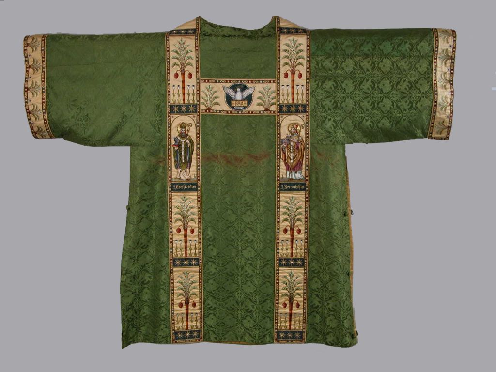 Groene dalmatiek met ingeweven griffioenen e.a. in vierpassen en heiligen