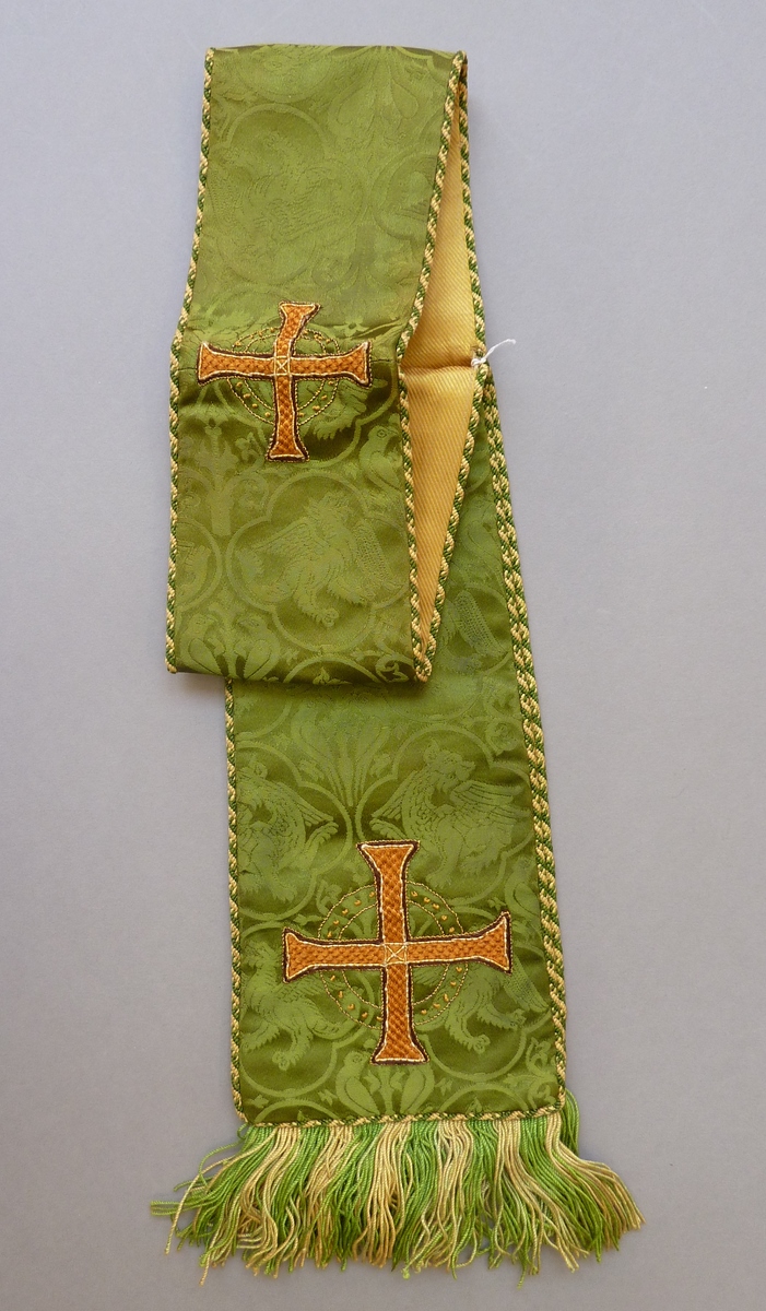 Groene manipel met ingeweven griffioenen in vierpassen, met groen-gele franje