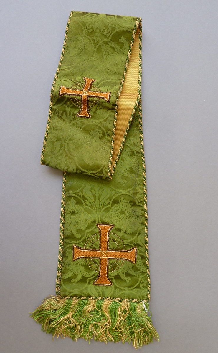 Groene manipel met ingeweven griffioenen in vierpassen, met groen-gele franje