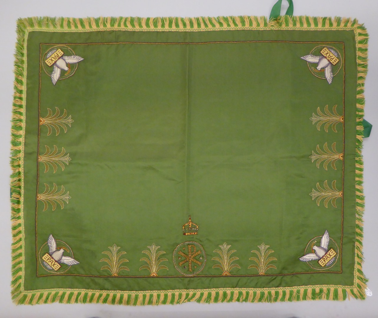 Groene gremiale met Christusmonogram met kroontje, in de hoeken duiven met "PAX"