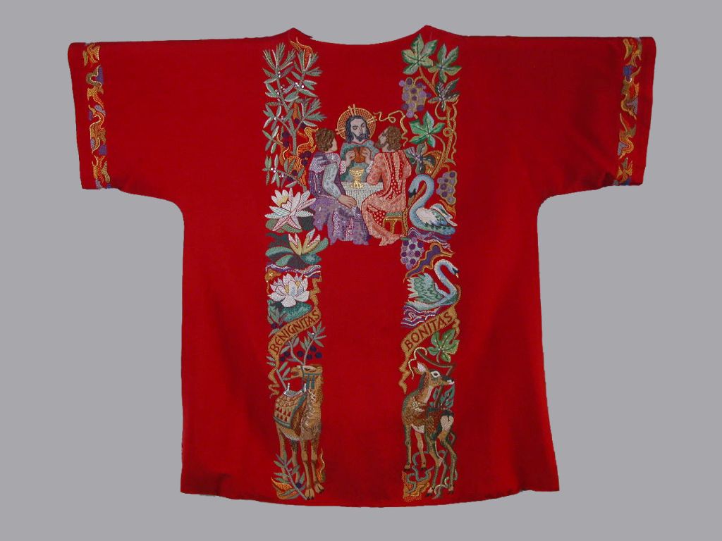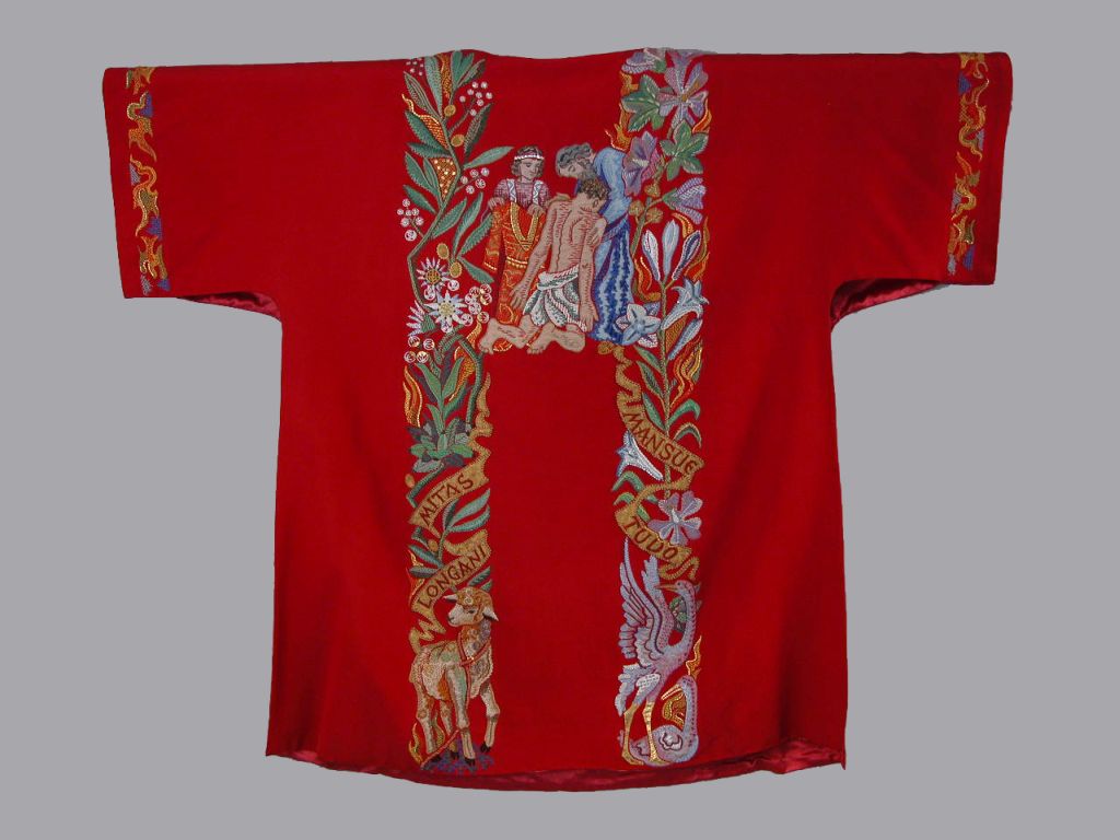 Rode dalmatiek met Emmausgangers en barmhartige Samaritaan